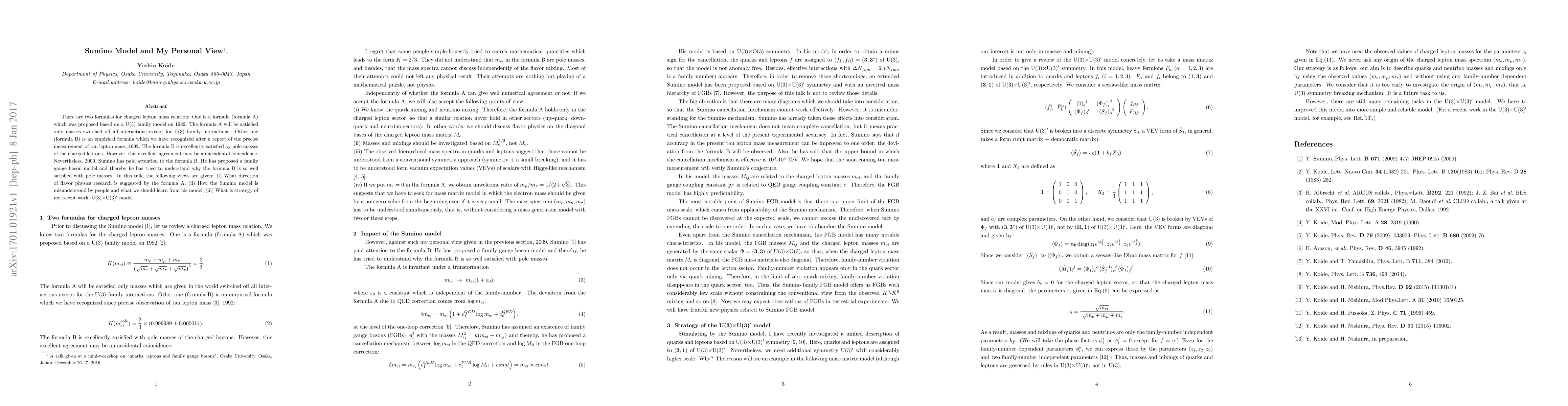 There are two formulas for charged lepton mass relation: One is a formula (formula A) which was proposed based on a U(3) family model on 1982. The formula A will be satisfied only masses switched off all interactions except for U(3) family interactions. Other one (formula B) is an empirical formula which we have recognized after a report of the precise measurement of tau lepton mass, 1992. The formula B is excellently satisfied by pole masses of the charged leptons. However, this excellent agreement may be an accidental coincidence. Nevertheless, 2009, Sumino has paid attention to the formula B. He has proposed a family gauge boson model and thereby he has tried to understand why the formula B is so well satisfied with pole masses. In this talk, the following views are given: (i) What direction of flavor physics research is suggested by the formula A; (ii) How the Sumino model is misunderstood by people and what we should learn from his model; (iii) What is strategy of my recent work, U(3)$\times$U(3)$'$ model.
