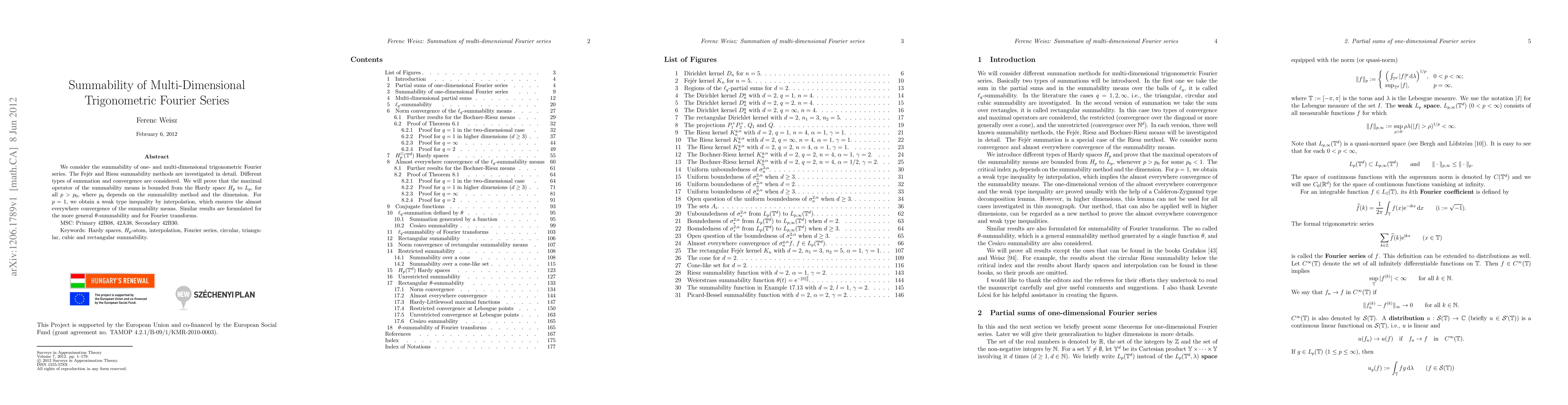 This paper investigates the summability of one- and multi-dimensional trigonometric Fourier series using Fejér and Riesz methods. It proves boundedness of the maximal operator from Hardy space $H_p$ to $L_p$ for $p > p_0$, ensuring almost everywhere convergence for $p=1$ via weak type inequalities.
