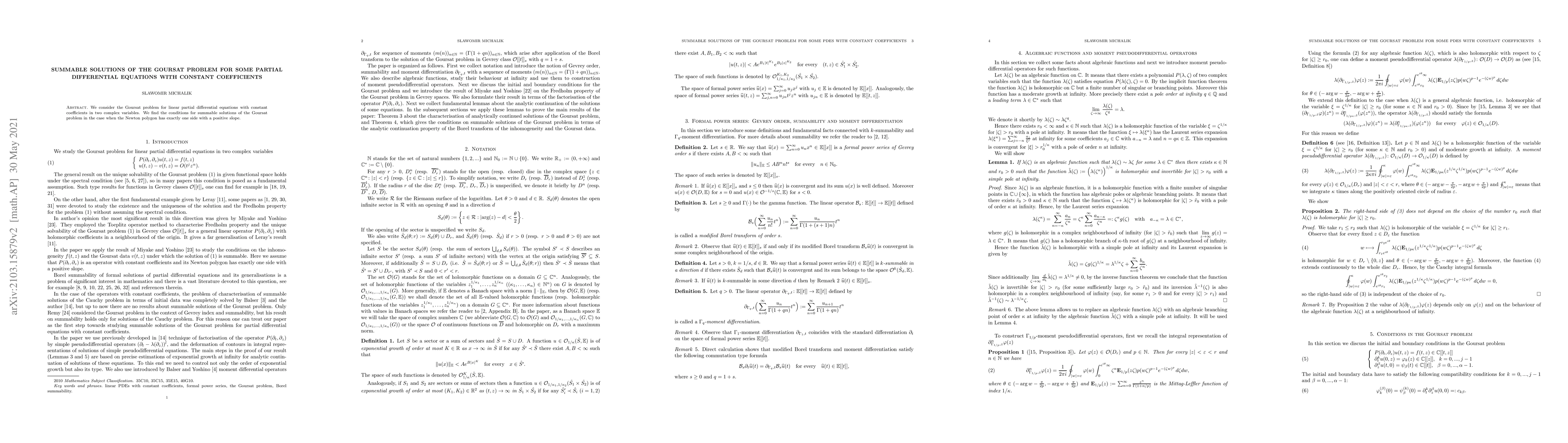 Summary: This paper investigates the conditions for summable solutions of the Goursat problem for linear partial differential equations with constant coefficients in two complex variables, focusing on cases where the Newton polygon has a single side with a positive slope. The study provides criteria for the existence of such solutions.