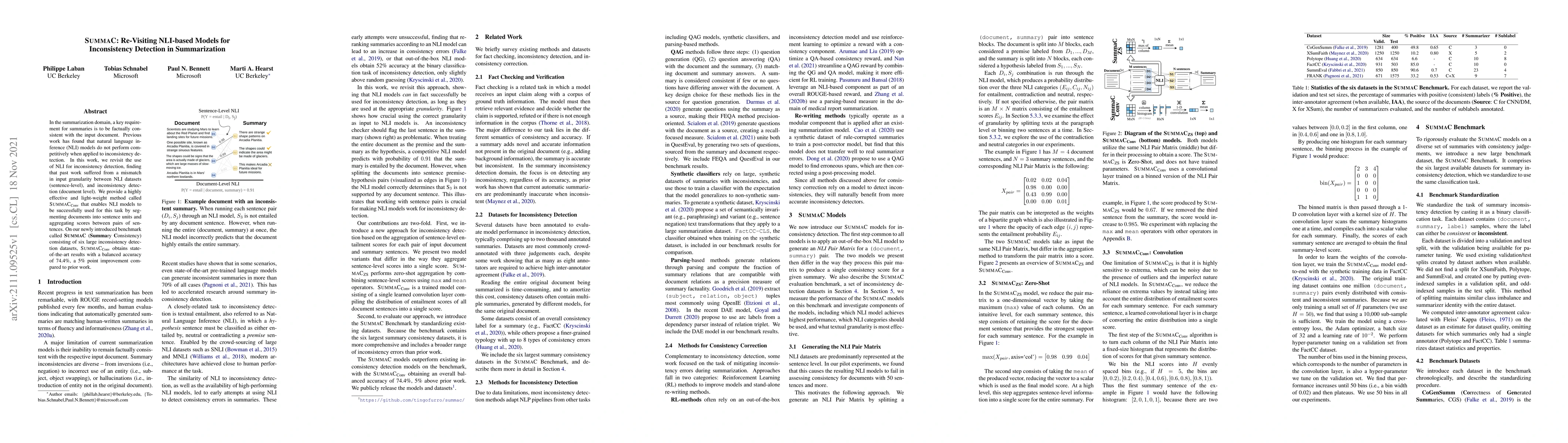 This paper proposes SummaCConv, a method that leverages natural language inference (NLI) models for detecting inconsistencies in summaries by segmenting documents into sentences for better granularity alignment. SummaCConv achieves state-of-the-art results on a new benchmark, SummaC, with a 5% improvement over previous methods.