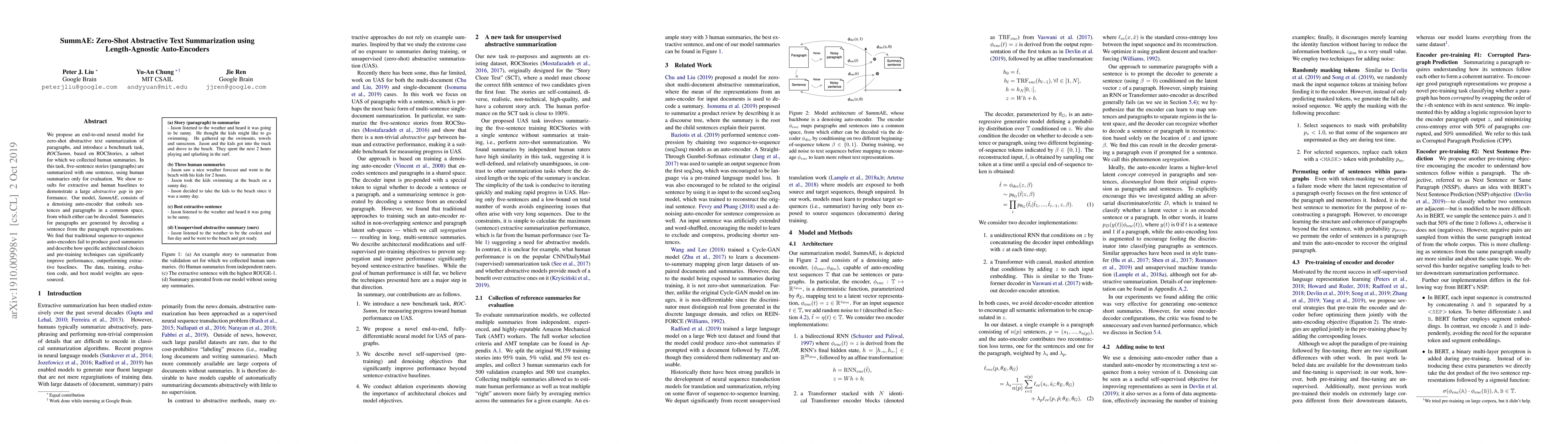 The paper introduces SummAE, a neural model for zero-shot abstractive text summarization, and establishes ROCSumm as a new benchmark for evaluating such models. SummAE outperforms extractive baselines by leveraging a denoising auto-encoder to embed and decode sentences and paragraphs, highlighting the effectiveness of specific architectural and pre-training strategies.
