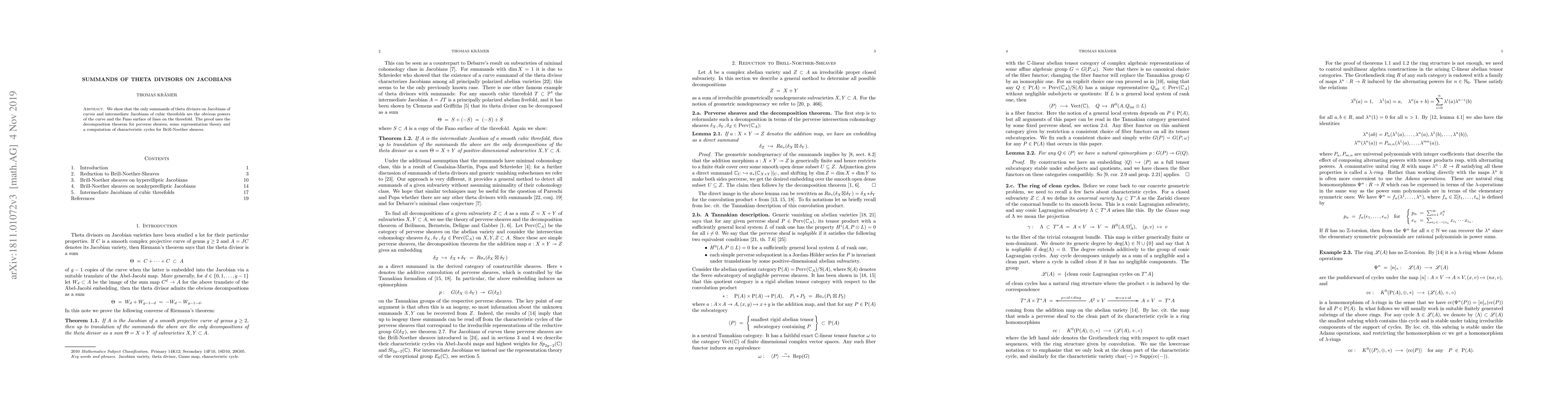 This paper demonstrates that the summands of theta divisors on Jacobians of curves and intermediate Jacobians of cubic threefolds are solely the expected powers of the curve and the Fano surface. The proof leverages the decomposition theorem for perverse sheaves, representation theory, and characteristic cycle computations for Brill-Noether sheaves.