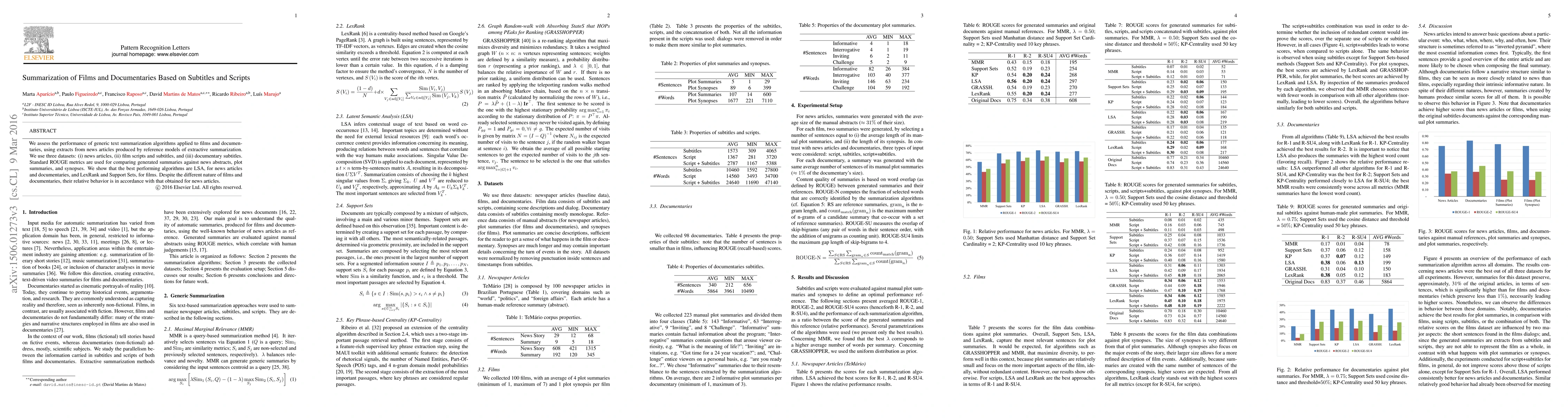 We assess the performance of generic text summarization algorithms applied to films and documentaries, using the well-known behavior of summarization of news articles as reference. We use three datasets: (i) news articles, (ii) film scripts and subtitles, and (iii) documentary subtitles. Standard ROUGE metrics are used for comparing generated summaries against news abstracts, plot summaries, and synopses. We show that the best performing algorithms are LSA, for news articles and documentaries, and LexRank and Support Sets, for films. Despite the different nature of films and documentaries, their relative behavior is in accordance with that obtained for news articles.