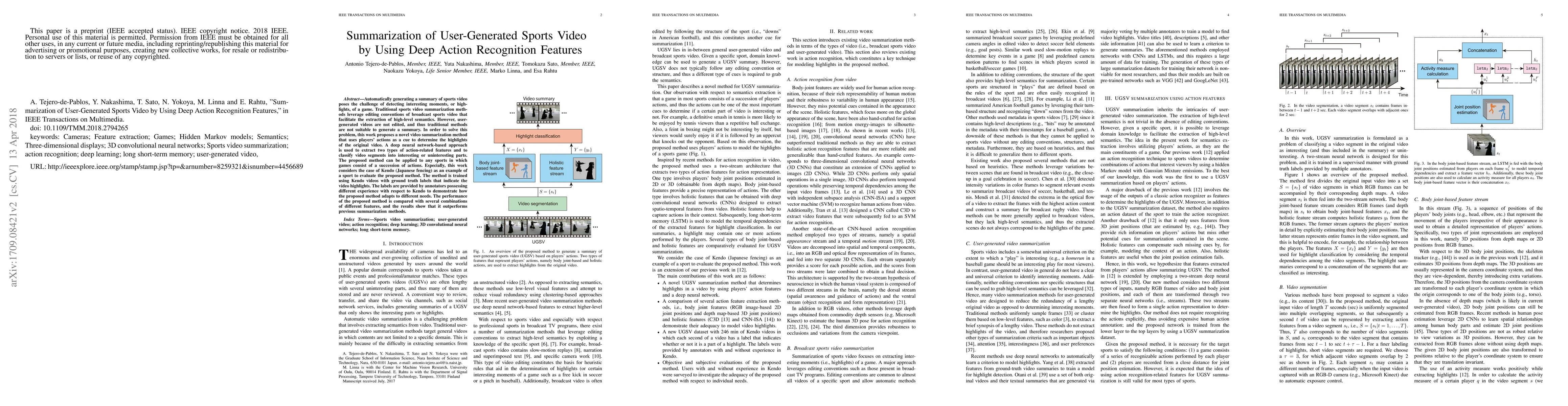 Automatically generating a summary of sports video poses the challenge of detecting interesting moments, or highlights, of a game. Traditional sports video summarization methods leverage editing conventions of broadcast sports video that facilitate the extraction of high-level semantics. However, user-generated videos are not edited, and thus traditional methods are not suitable to generate a summary. In order to solve this problem, this work proposes a novel video summarization method that uses players' actions as a cue to determine the highlights of the original video. A deep neural network-based approach is used to extract two types of action-related features and to classify video segments into interesting or uninteresting parts. The proposed method can be applied to any sports in which games consist of a succession of actions. Especially, this work considers the case of Kendo (Japanese fencing) as an example of a sport to evaluate the proposed method. The method is trained using Kendo videos with ground truth labels that indicate the video highlights. The labels are provided by annotators possessing different experience with respect to Kendo to demonstrate how the proposed method adapts to different needs. The performance of the proposed method is compared with several combinations of different features, and the results show that it outperforms previous summarization methods.