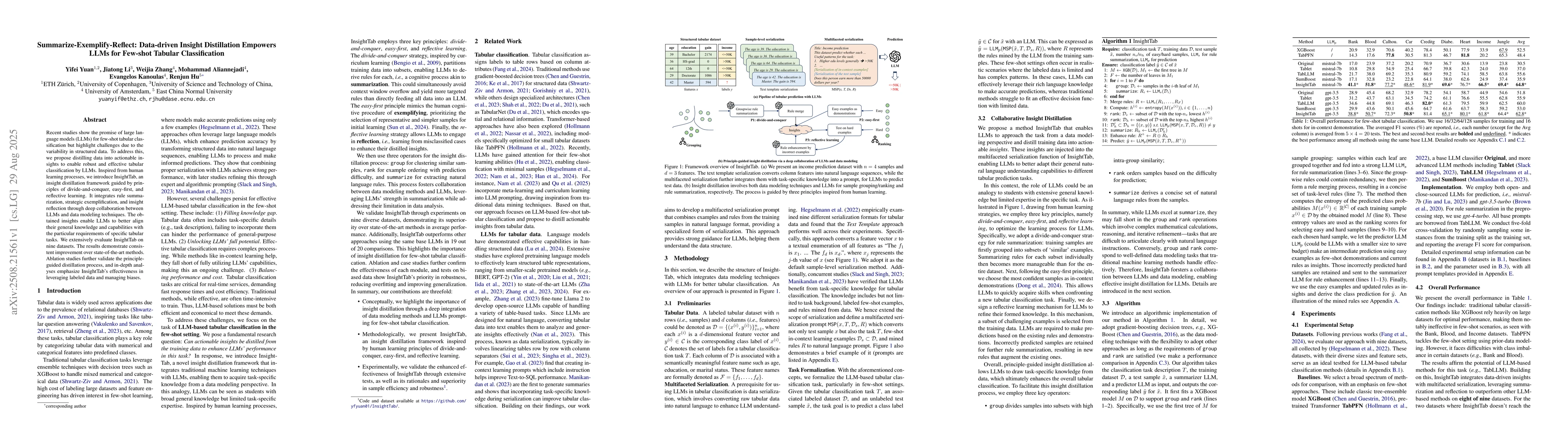Recent studies show the promise of large language models (LLMs) for few-shot tabular classification but highlight challenges due to the variability in structured data. To address this, we propose distilling data into actionable insights to enable robust and effective classification by LLMs. Drawing inspiration from human learning processes, we introduce InsightTab, an insight distillation framework guided by principles of divide-and-conquer, easy-first, and reflective learning. Our approach integrates rule summarization, strategic exemplification, and insight reflection through deep collaboration between LLMs and data modeling techniques. The obtained insights enable LLMs to better align their general knowledge and capabilities with the particular requirements of specific tabular tasks. We extensively evaluate InsightTab on nine datasets. The results demonstrate consistent improvement over state-of-the-art methods. Ablation studies further validate the principle-guided distillation process, while analyses emphasize InsightTab's effectiveness in leveraging labeled data and managing bias.