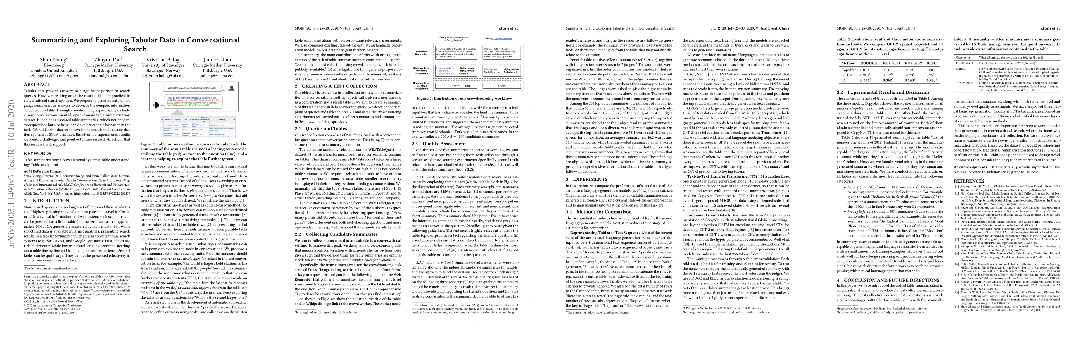 Tabular data provide answers to a significant portion of search queries. However, reciting an entire result table is impractical in conversational search systems. We propose to generate natural language summaries as answers to describe the complex information contained in a table. Through crowdsourcing experiments, we build a new conversation-oriented, open-domain table summarization dataset. It includes annotated table summaries, which not only answer questions but also help people explore other information in the table. We utilize this dataset to develop automatic table summarization systems as SOTA baselines. Based on the experimental results, we identify challenges and point out future research directions that this resource will support.