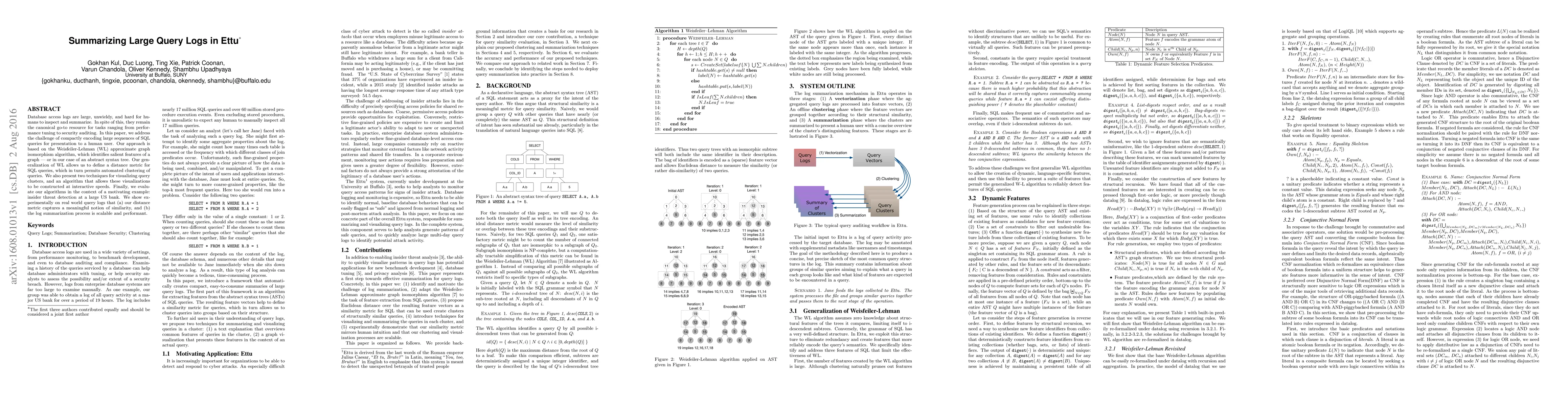 Database access logs are large, unwieldy, and hard for humans to inspect and summarize. In spite of this, they remain the canonical go-to resource for tasks ranging from performance tuning to security auditing. In this paper, we address the challenge of compactly encoding large sequences of SQL queries for presentation to a human user. Our approach is based on the Weisfeiler-Lehman (WL) approximate graph isomorphism algorithm, which identifies salient features of a graph or in our case of an abstract syntax tree. Our generalization of WL allows us to define a distance metric for SQL queries, which in turn permits automated clustering of queries. We also present two techniques for visualizing query clusters, and an algorithm that allows these visualizations to be constructed at interactive speeds. Finally, we evaluate our algorithms in the context of a motivating example: insider threat detection at a large US bank. We show experimentally on real world query logs that (a) our distance metric captures a meaningful notion of similarity, and (b) the log summarization process is scalable and performant.