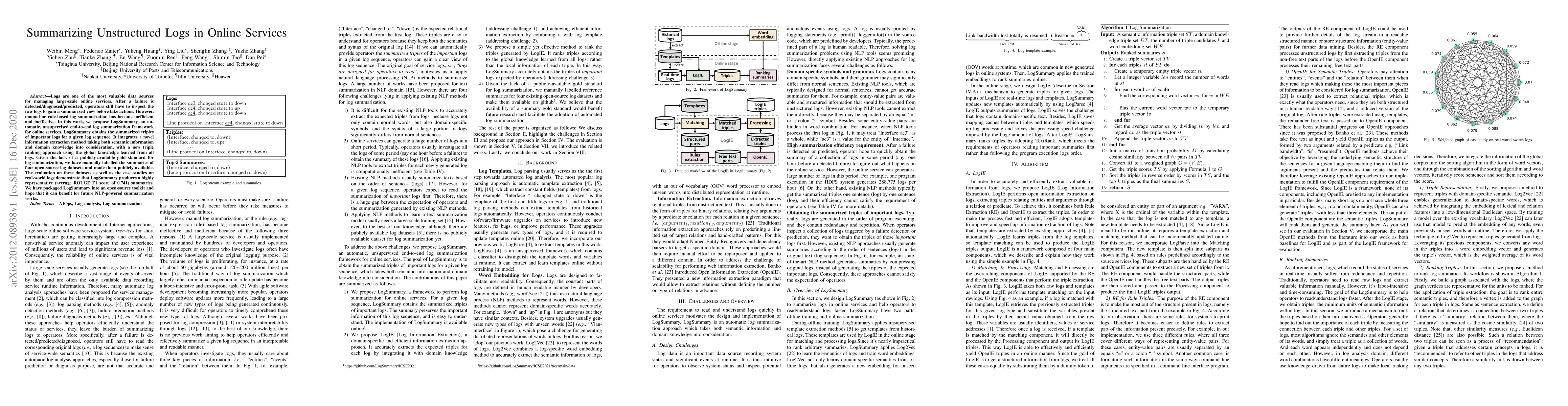 Logs are one of the most valuable data sources for managing large-scale online services. After a failure is detected/diagnosed/predicted, operators still have to inspect the raw logs to gain a summarized view before take actions. However, manual or rule-based log summarization has become inefficient and ineffective. In this work, we propose LogSummary, an automatic, unsupervised end-to-end log summarization framework for online services. LogSummary obtains the summarized triples of important logs for a given log sequence. It integrates a novel information extraction method taking both semantic information and domain knowledge into consideration, with a new triple ranking approach using the global knowledge learned from all logs. Given the lack of a publicly-available gold standard for log summarization, we have manually labelled the summaries of four open-source log datasets and made them publicly available. The evaluation on these datasets as well as the case studies on real-world logs demonstrate that LogSummary produces a highly representative (average ROUGE F1 score of 0.741) summaries. We have packaged LogSummary into an open-source toolkit and hope that it can benefit for future NLP-powered summarization works.
