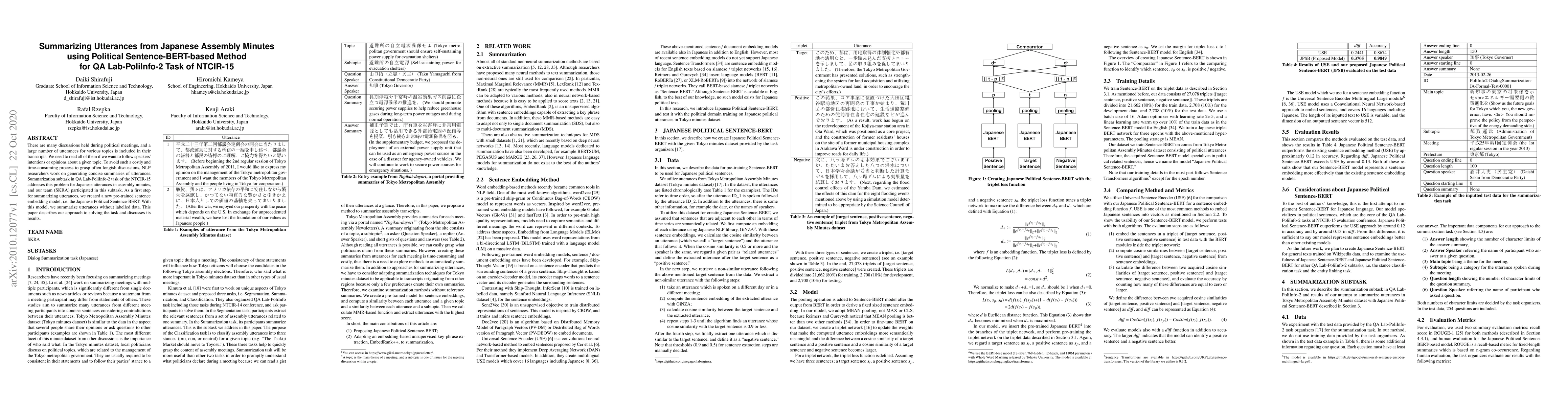 There are many discussions held during political meetings, and a large number of utterances for various topics is included in their transcripts. We need to read all of them if we want to follow speakers\' intentions or opinions about a given topic. To avoid such a costly and time-consuming process to grasp often longish discussions, NLP researchers work on generating concise summaries of utterances. Summarization subtask in QA Lab-PoliInfo-2 task of the NTCIR-15 addresses this problem for Japanese utterances in assembly minutes, and our team (SKRA) participated in this subtask. As a first step for summarizing utterances, we created a new pre-trained sentence embedding model, i.e. the Japanese Political Sentence-BERT. With this model, we summarize utterances without labelled data. This paper describes our approach to solving the task and discusses its results.