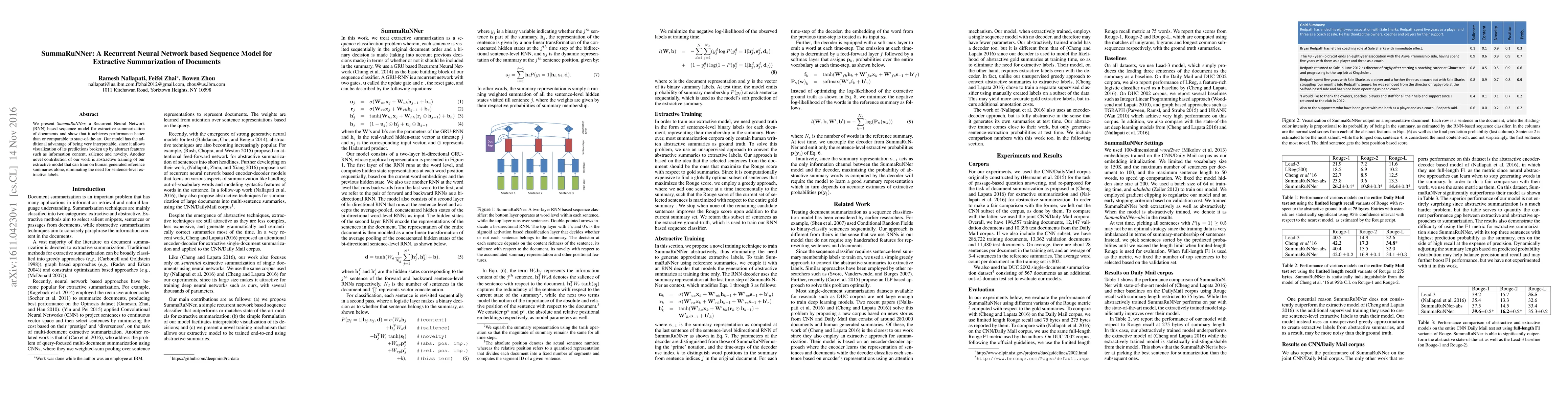 SummaRuNNer is an RNN-based sequence model for extractive summarization that outperforms or matches state-of-the-art methods. It offers interpretability by visualizing predictions based on features like information content, salience, and novelty, and can be trained abstractively using only human-generated summaries.
