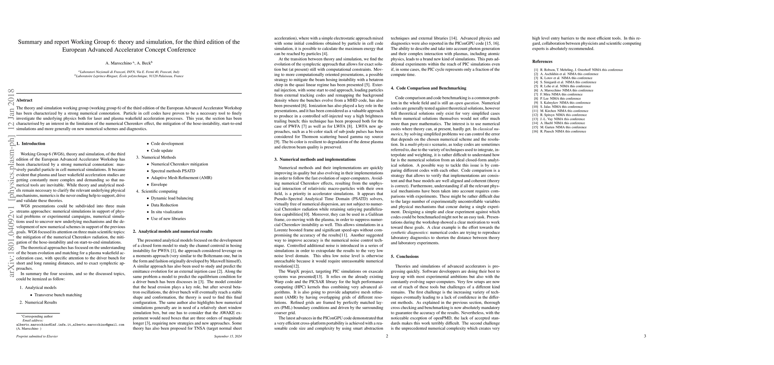 The theory and simulation working group (working group 6) of the third edition of the European Advanced Accelerator Workshop has been characterized by a strong numerical connotation. Particle in cell codes have proven to be a necessary tool to finely investigate the underlying physics both for laser and plasma wakefield acceleration processes. This year, the section has been characterised by an interest in the limitation of the numerical Cherenkov effect, the mitigation of the hose-instability, start-to-end simulations and more generally on new numerical schemes and diagnostics.