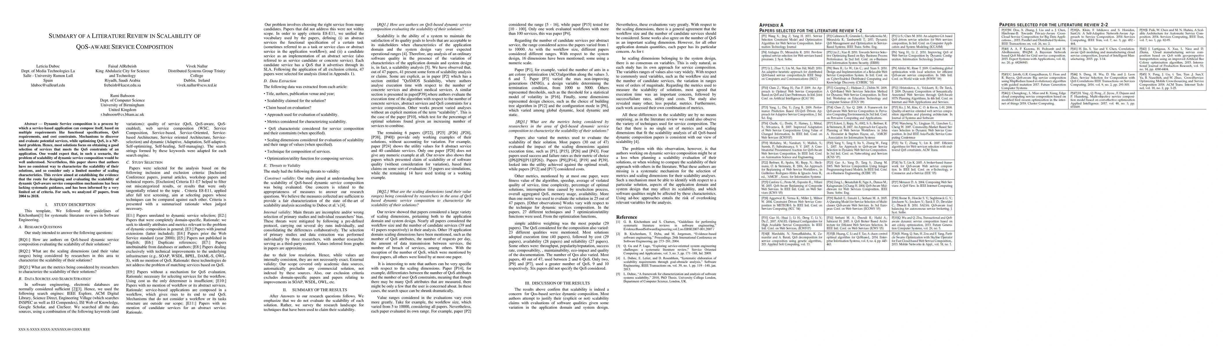 This paper shows that authors have no consistent way to characterize the scalability of their solutions, and so consider only a limited number of scaling characteristics. This review aimed at establishing the evidence that the route for designing and evaluating the scalability of dynamic QoS-aware service composition mechanisms has been lacking systematic guidance, and has been informed by a very limited set of criteria. For such, we analyzed 47 papers, from 2004 to 2018.