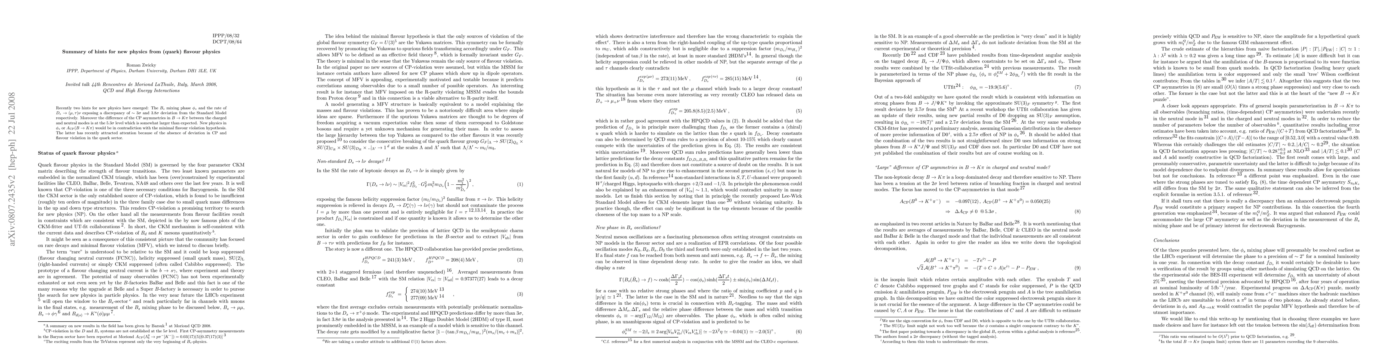 Recently two hints for new physics have emerged: The B_s mixing phase phi_s and the rate of D_s -> (mu,tau) nu exposing a discrepancy of \sim 3 sigma and 3.8 sigma deviation from the Standard Model respectively. Moreover the difference of the CP asymmetries in B -> K pi between the charged and neutral modes is at the 5.3 sigma level which is somewhat larger than expected. New physics in phi_s or A_CP(B -> K pi) would be in contradiction with the minimal flavour violation hypothesis. The latter has recently attracted attention because of the absence of deviation in CP and flavour violation in the quark sector.