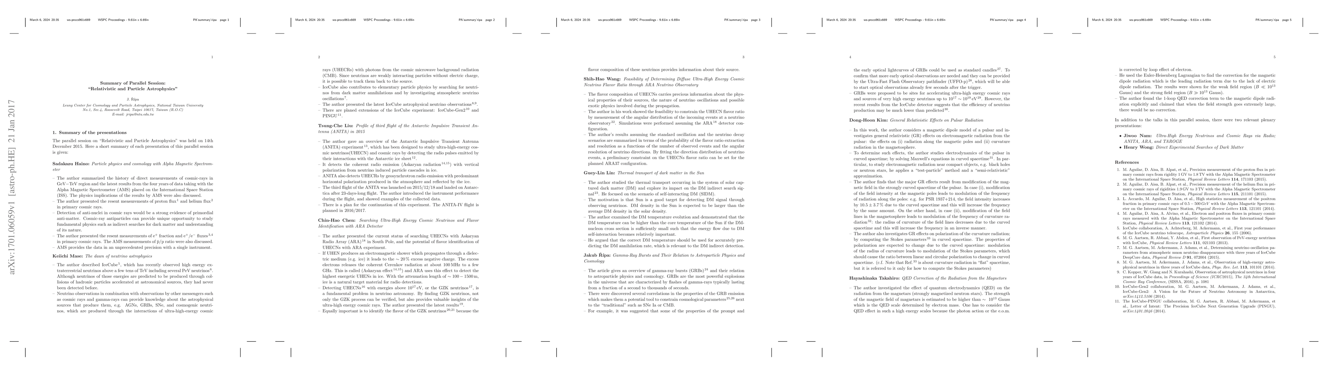 The parallel session on "Relativistic and Particle Astrophysics" was held on 14th December 2015. Here a short summary of each presentation of this parallel session is given.
