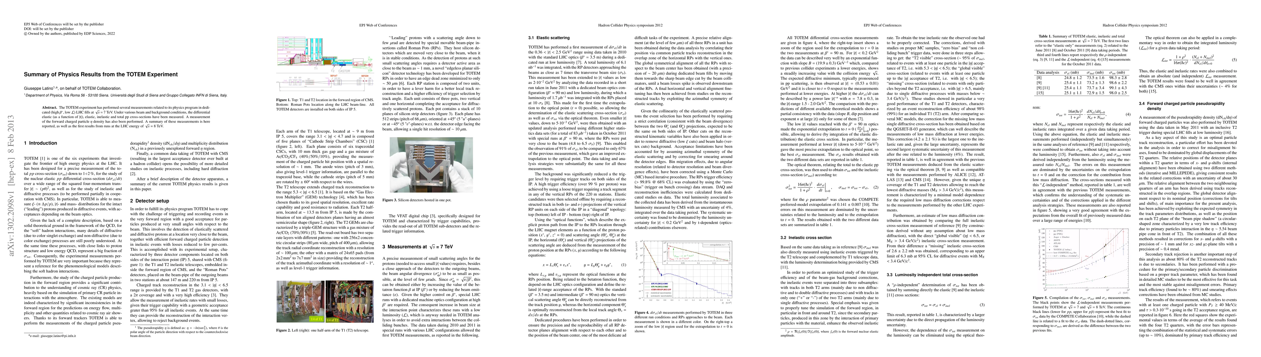 The TOTEM experiment has performed several measurements related to its physics program in dedicated (high \beta*, low L) LHC fills at $\sqrt{s}$ = 7 TeV. Under various beam and background conditions, the differential elastic (as a function of |t|), elastic, inelastic and total pp cross-sections have been measured. A measurement of the forward charged particle \eta density has also been performed. A summary of these measurements is here reported, as well as the first results from runs at the LHC energy of $\sqrt{s}$ = 8 TeV.