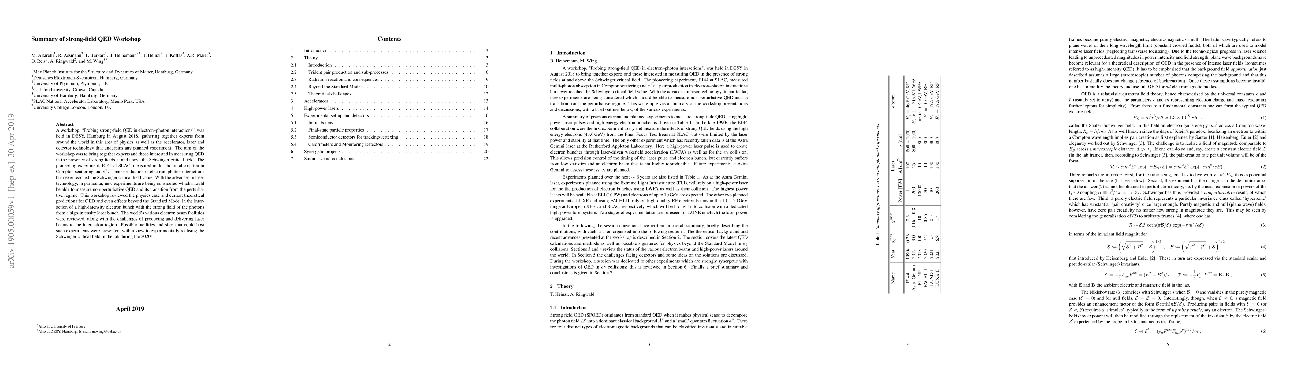 A workshop, "Probing strong-field QED in electron--photon interactions", was held in DESY, Hamburg in August 2018, gathering together experts from around the world in this area of physics as well as the accelerator, laser and detector technology that underpins any planned experiment. The aim of the workshop was to bring together experts and those interested in measuring QED in the presence of strong fields at and above the Schwinger critical field. The pioneering experiment, E144 at SLAC, measured multi-photon absorption in Compton scattering and $e^+e^-$ pair production in electron--photon interactions but never reached the Schwinger critical field value. With the advances in laser technology, in particular, new experiments are being considered which should be able to measure non-perturbative QED and its transition from the perturbative regime. This workshop reviewed the physics case and current theoretical predictions for QED and even effects beyond the Standard Model in the interaction of a high-intensity electron bunch with the strong field of the photons from a high-intensity laser bunch. The world's various electron beam facilities were reviewed, along with the challenges of producing and delivering laser beams to the interaction region. Possible facilities and sites that could host such experiments were presented, with a view to experimentally realising the Schwinger critical field in the lab during the 2020s.