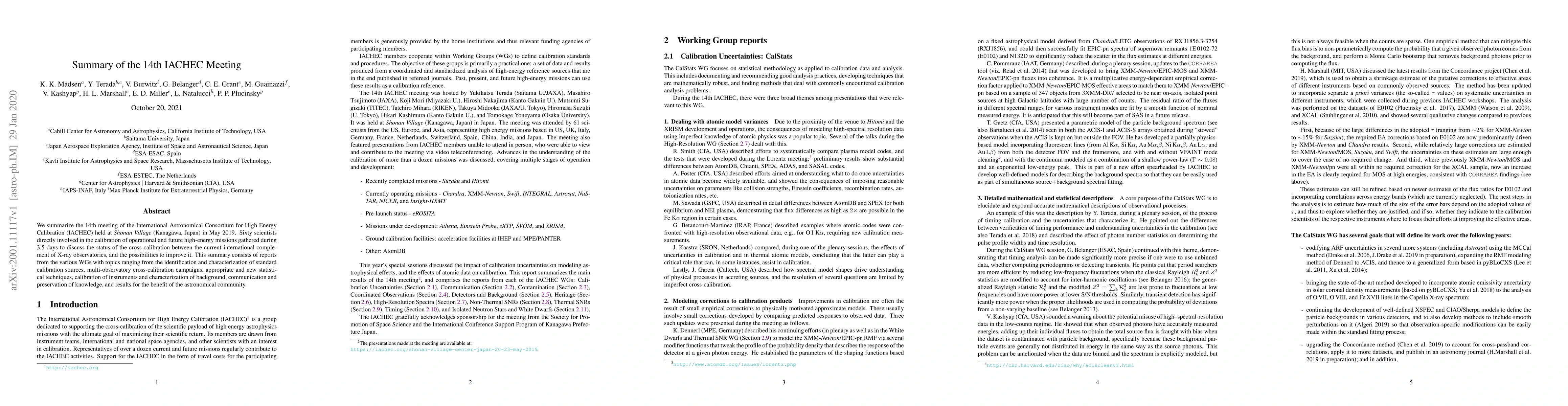 We summarize the 14th meeting of the International Astronomical Consortium for High Energy Calibration (IACHEC) held at \textit{Shonan Village} (Kanagawa, Japan) in May 2019. Sixty scientists directly involved in the calibration of operational and future high-energy missions gathered during 3.5 days to discuss the status of the cross-calibration between the current international complement of X-ray observatories, and the possibilities to improve it. This summary consists of reports from the various WGs with topics ranging from the identification and characterization of standard calibration sources, multi-observatory cross-calibration campaigns, appropriate and new statistical techniques, calibration of instruments and characterization of background, communication and preservation of knowledge, and results for the benefit of the astronomical community.