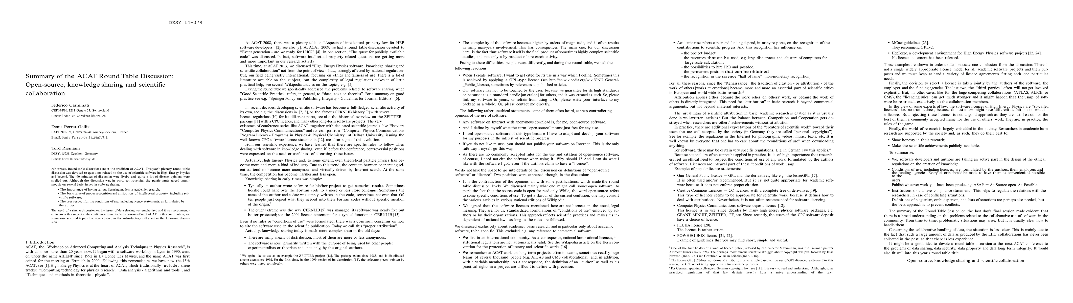 The ACAT Round Table Discussion emphasized the importance of diverse licensing models, proper recognition of intellectual property, and respect for software use conditions in scientific collaboration. The discussion highlighted the need for future talks on data sharing to further these collaborative efforts.