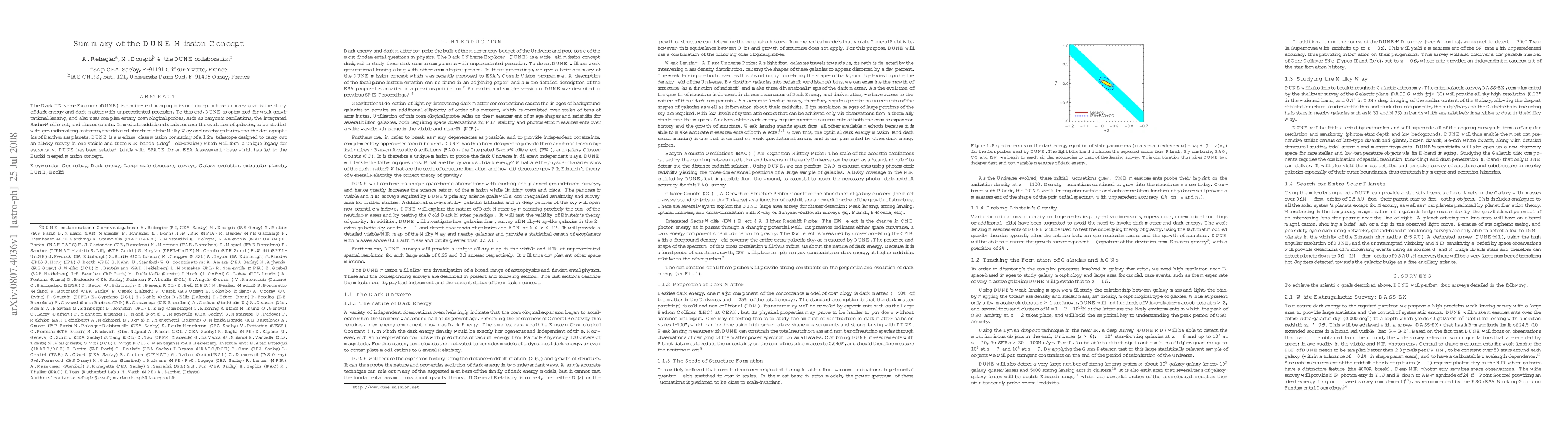 The Dark UNiverse Explorer (DUNE) is a wide-field imaging mission concept whose primary goal is the study of dark energy and dark matter with unprecedented precision. To this end, DUNE is optimised for weak gravitational lensing, and also uses complementary cosmolo gical probes, such as baryonic oscillations, the integrated Sachs-Wolf effect, a nd cluster counts. Immediate additional goals concern the evolution of galaxies, to be studied with groundbreaking statistics, the detailed structure of the Milky Way and nearby galaxies, and the demographics of Earth-mass planets. DUNE is a medium class mission consisting of a 1.2m telescope designed to carry out an all-sky survey in one visible and three NIR bands (1deg$^2$ field-of-view) which will form a unique legacy for astronomy. DUNE has been selected jointly with SPACE for an ESA Assessment phase which has led to the Euclid merged mission concept.