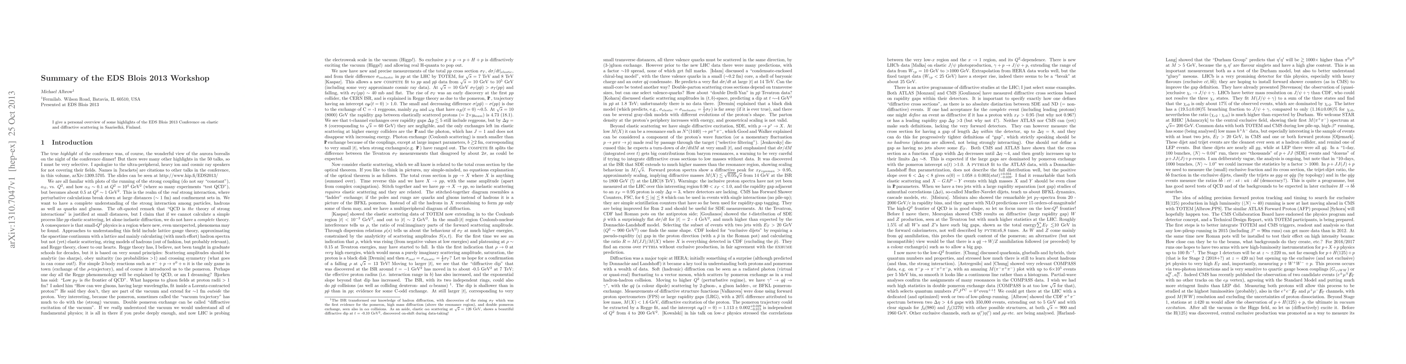 The EDS Blois 2013 Workshop in Saariselka, Finland, focused on elastic and diffractive scattering, presenting key insights and discussions on the latest advancements in the field. This summary highlights significant contributions and emerging trends discussed during the conference.