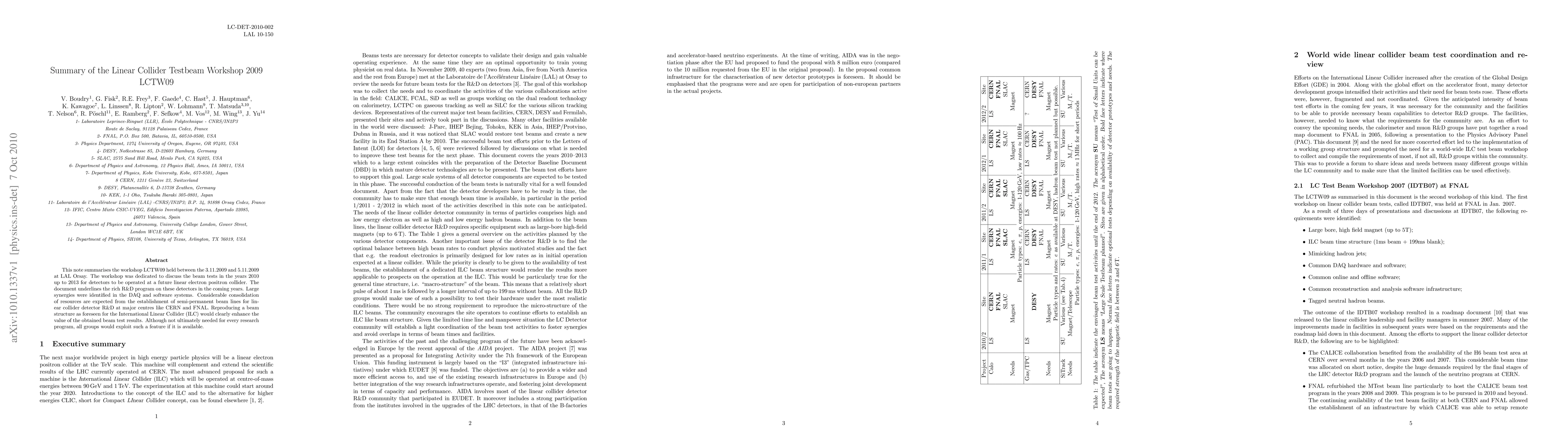 This note summarises the workshop LCTW09 held between the 3.11.2009 and 5.11.2009 at LAL Orsay. The workshop was dedicated to discuss the beam tests in the years 2010 up to 2013 for detectors to be operated at a future linear electron positron collider. The document underlines the rich R&D program on these detectors in the coming years. Large synergies were identified in the DAQ and software systems. Considerable consolidation of resources are expected from the establishment of semi-permanent beam lines for linear collider detector R&D at major centres like CERN and FNAL. Reproducing a beam structure as foreseen for the International Linear Collider (ILC) would clearly enhance the value of the obtained beam test results. Although not ultimately needed for every research program, all groups would exploit such a feature if it is available.