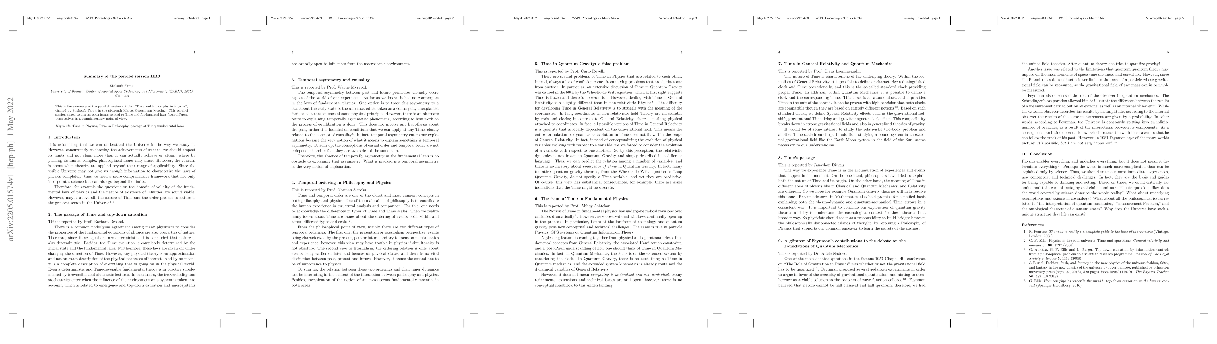 This parallel session at the sixteenth Marcel Grossmann Meeting, chaired by Shokoufe Faraji, explored open issues related to time and fundamental laws in physics from various philosophical and complementary perspectives. The discussions aimed to integrate diverse viewpoints on the nature of time in physical theories.