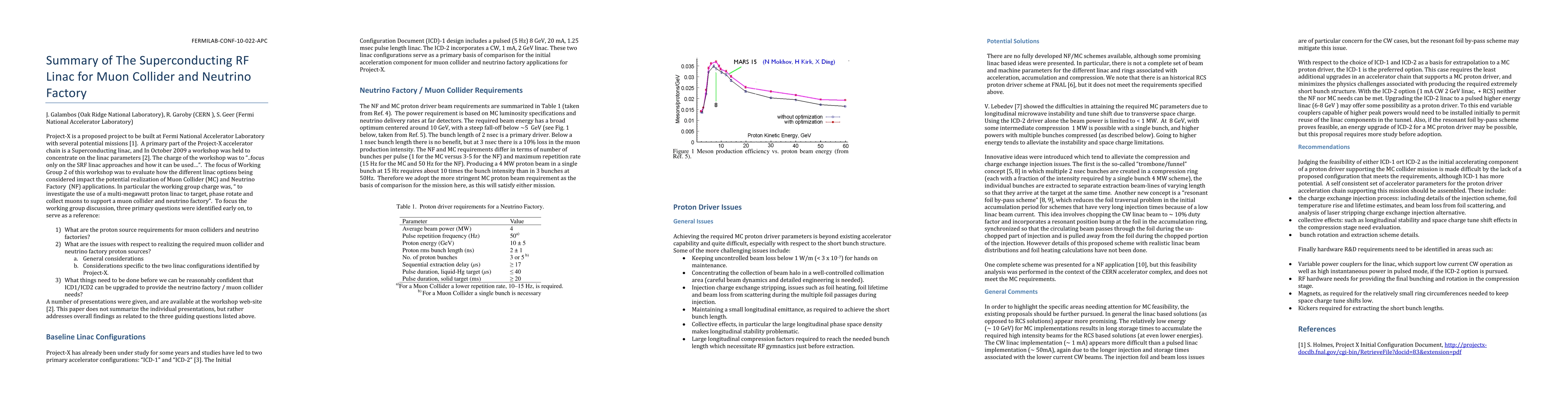 This paper summarizes findings from a workshop on the Superconducting RF linac for Project-X, focusing on its role in supporting Muon Collider and Neutrino Factory applications. The study evaluates proton source requirements, challenges in realizing these sources, and the necessary upgrades to existing infrastructure to meet future needs.