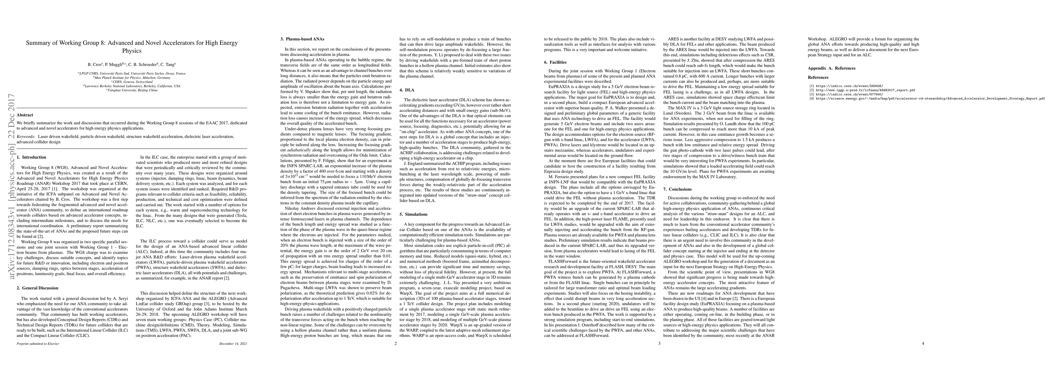 We briefly summarize the work and discussions that occurred during the Working Group 8 sessions of the EAAC 2017, dedicated to advanced and novel accelerators for high energy physics applications.