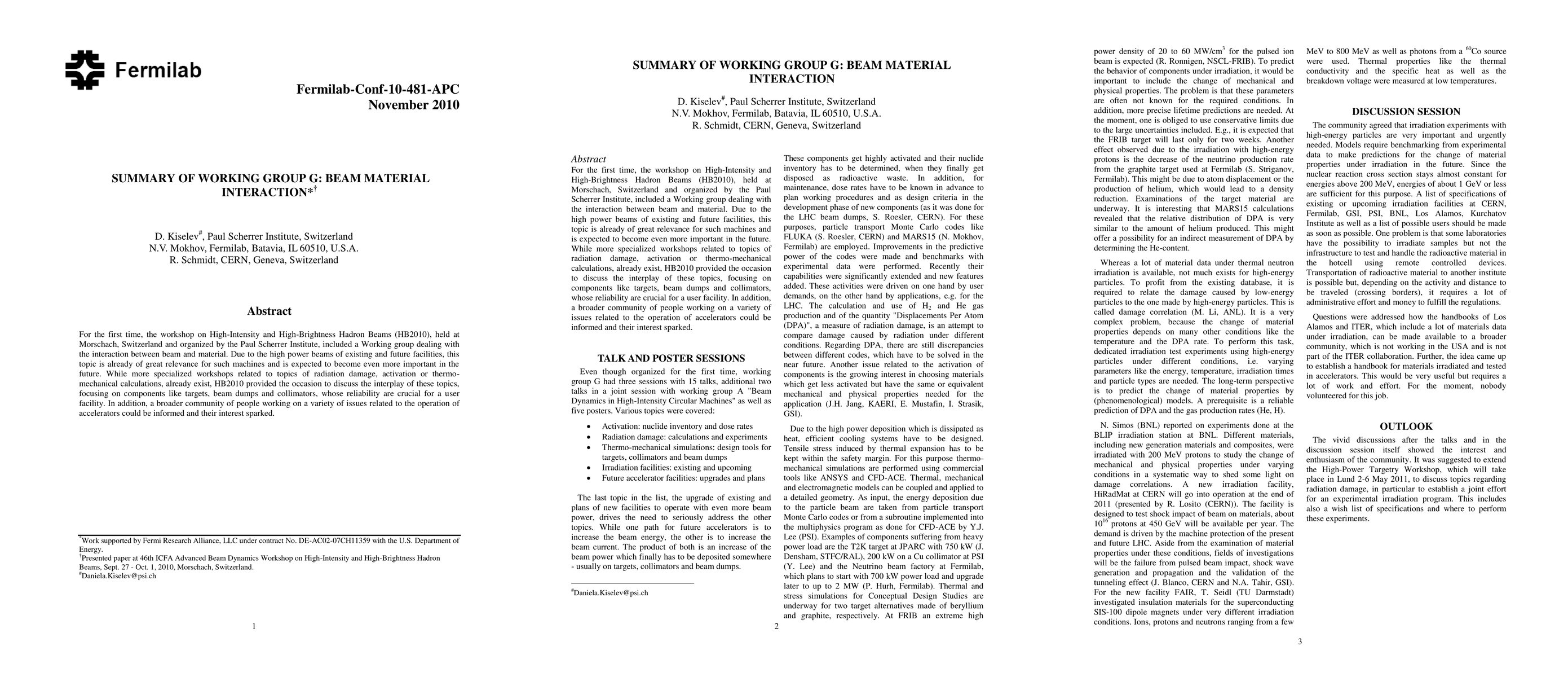 For the first time, the workshop on High-Intensity and High-Brightness Hadron Beams (HB2010), held at Morschach, Switzerland and organized by the Paul Scherrer Institute, included a Working group dealing with the interaction between beam and material. Due to the high power beams of existing and future facilities, this topic is already of great relevance for such machines and is expected to become even more important in the future. While more specialized workshops related to topics of radiation damage, activation or thermo - mechanical calculations, already exist, HB2010 provided the occasion to discuss the interplay of these topics, focusing on components like targets, beam dumps and collimators, whose reliability are crucial for a user facility. In addition, a broader community of people working on a variety of issues related to the operation of accelerators could be informed and their interest sparked.