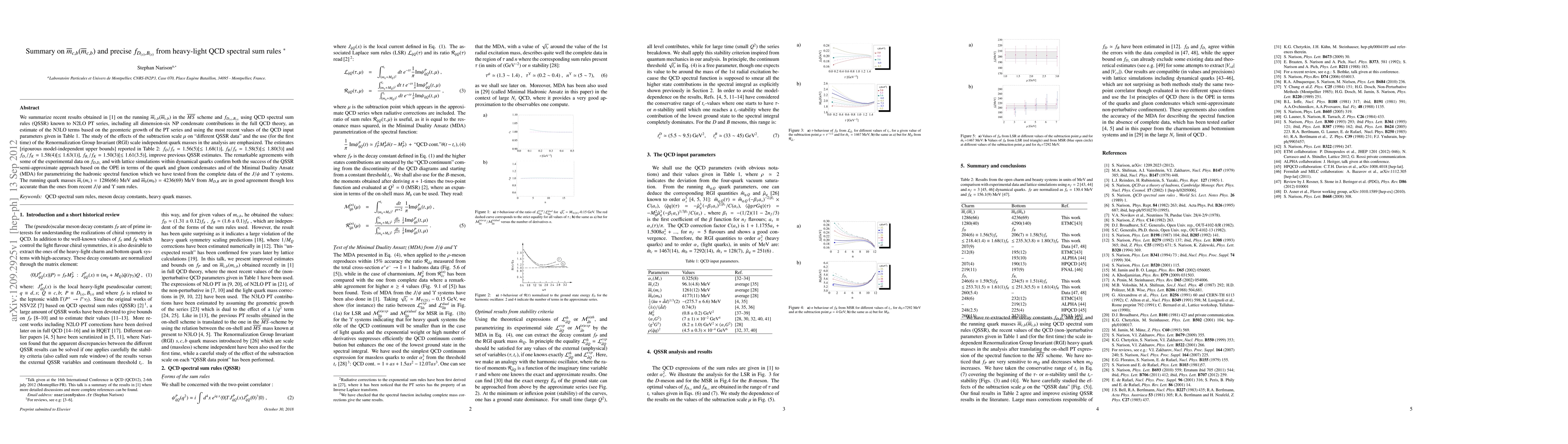 We summarize recent results obtained in [1] on the running m_{c,b}(m_{c,b}) in the MS scheme and f_{D_(s), B_(s)} using QCD spectral sum rules (QSSR) known to N2LO PT series, including all dimension-six NP condensate contributions in the full QCD theory, an estimate of the N3LO terms based on the geomteric growth of the PT series and using the most recent values of the QCD input parameters given in Table [1]. The study of the effects of the subtraction scale \mu on "different QSSR data" and the use (for the first time) of the Renormalization Group Invariant (RGI) scale independent quark masses in the analysis are emphasized. The estimates [rigourous model-independent upper bounds] reported in Table 2: f_D/f_\pi=1.56(5)[< 1.68(1)], f_B/f_\pi=1.58(5)[< 1.80(3)] and f_{D_s}/f_K= 1.58(4) [< 1.63(1)], f_{B_s}/f_K=1.50(3)[< 1.61(3.5)], improve previous QSSR estimates. The remarkable agreements with some of the experimental data on f_{D,D_s} and with lattice simulations within dynamical quarks confirm both the success of the QSSR semi-approximate approach based on the OPE in terms of the quark and gluon condensates and of the Minimal Duality Ansatz (MDA) for parametrizing the hadronic spectral function which we have tested from the complete data of the J/\psi and \Upsilon systems. The running quark masses m_c({m_c})=1286(66) MeV and m_b({m_b})= 4236(69) MeV from M_{D,B} are in good agreement though less accurate than the ones from recent J/\psi and \Upsilon sum rules.