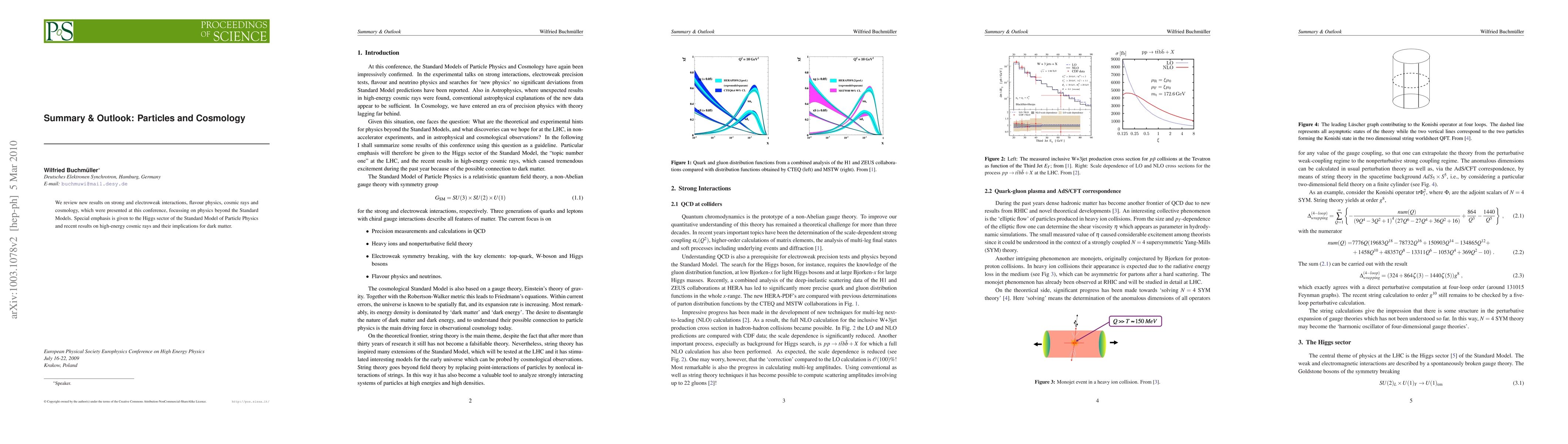We review new results on strong and electroweak interactions, flavour physics, cosmic rays and cosmology, which were presented at this conference, focussing on physics beyond the Standard Models. Special emphasis is given to the Higgs sector of the Standard Model of Particle Physics and recent results on high-energy cosmic rays and their implications for dark matter.