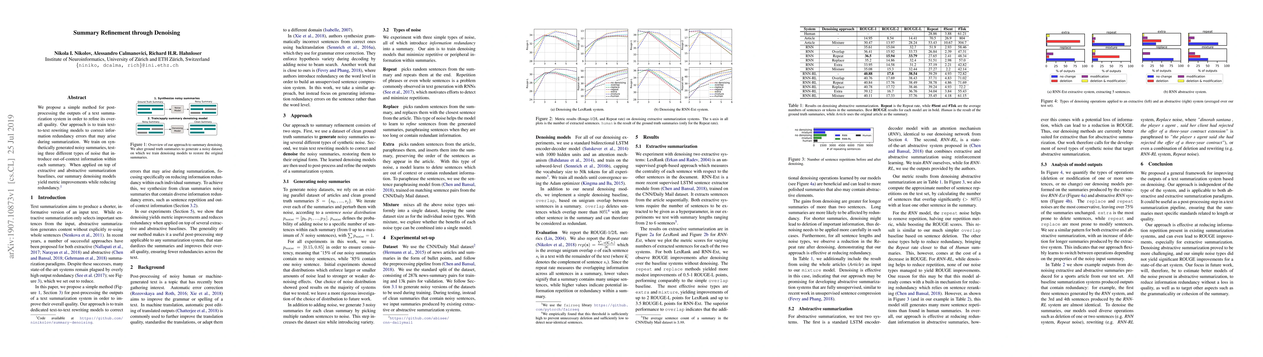 We propose a simple method for post-processing the outputs of a text summarization system in order to refine its overall quality. Our approach is to train text-to-text rewriting models to correct information redundancy errors that may arise during summarization. We train on synthetically generated noisy summaries, testing three different types of noise that introduce out-of-context information within each summary. When applied on top of extractive and abstractive summarization baselines, our summary denoising models yield metric improvements while reducing redundancy.