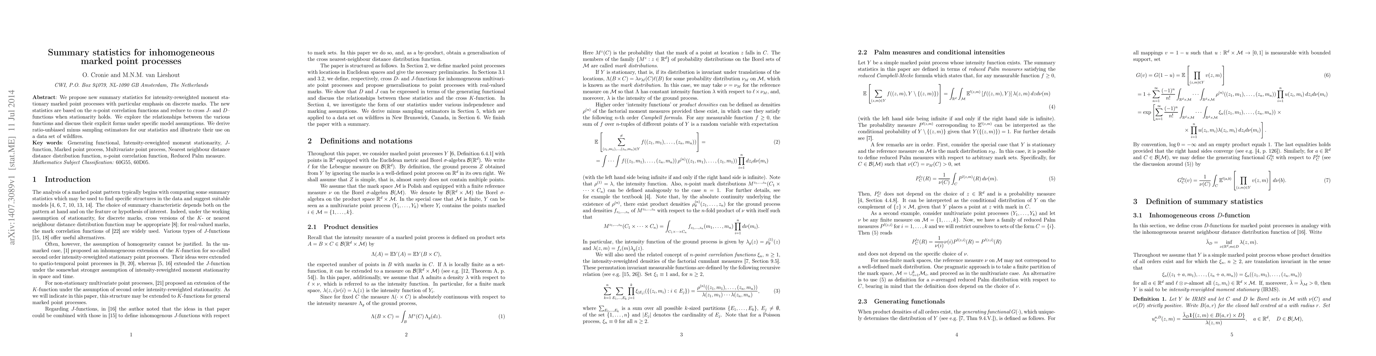 This paper introduces new summary statistics for intensity-reweighted moment stationary marked point processes, focusing on discrete marks, and derives unbiased estimators for these statistics. The statistics are based on n-point correlation functions and are particularly useful for analyzing wildfire data.