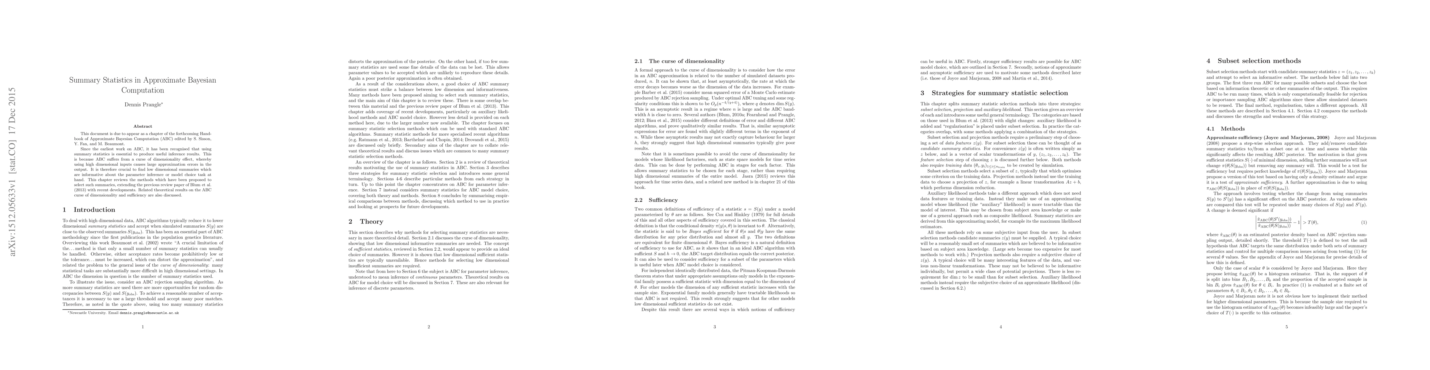 This paper reviews methods for selecting informative summary statistics in Approximate Bayesian Computation (ABC) to address the curse of dimensionality, extending previous work and discussing recent developments and theoretical results on sufficiency and approximation errors.