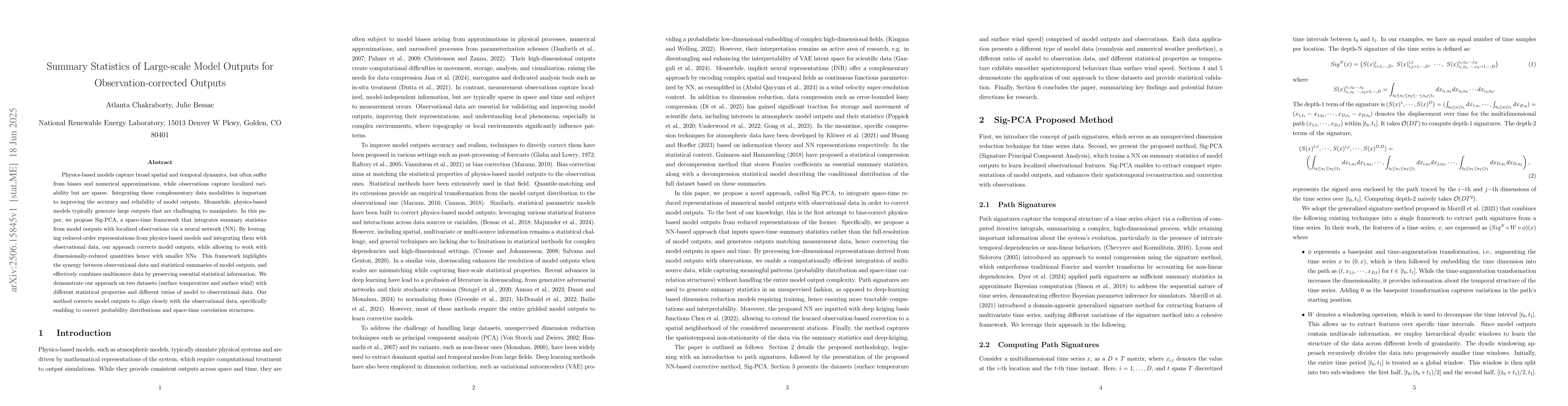 Physics-based models capture broad spatial and temporal dynamics, but often suffer from biases and numerical approximations, while observations capture localized variability but are sparse. Integrating these complementary data modalities is important to improving the accuracy and reliability of model outputs. Meanwhile, physics-based models typically generate large outputs that are challenging to manipulate. In this paper, we propose Sig-PCA, a space-time framework that integrates summary statistics from model outputs with localized observations via a neural network (NN). By leveraging reduced-order representations from physics-based models and integrating them with observational data, our approach corrects model outputs, while allowing to work with dimensionally-reduced quantities hence with smaller NNs. This framework highlights the synergy between observational data and statistical summaries of model outputs, and effectively combines multisource data by preserving essential statistical information. We demonstrate our approach on two datasets (surface temperature and surface wind) with different statistical properties and different ratios of model to observational data. Our method corrects model outputs to align closely with the observational data, specifically enabling to correct probability distributions and space-time correlation structures.