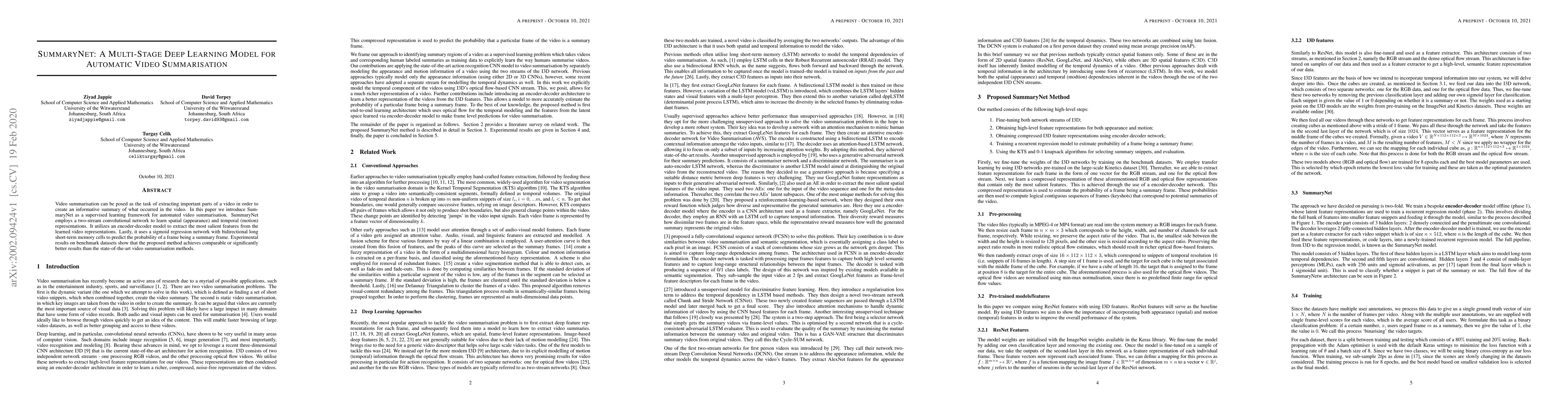 SummaryNet is a supervised deep learning framework for automated video summarisation, employing a two-stream convolutional network and an encoder-decoder model to extract salient features, followed by a sigmoid regression network with bidirectional LSTMs to identify summary frames, achieving competitive results on benchmark datasets.