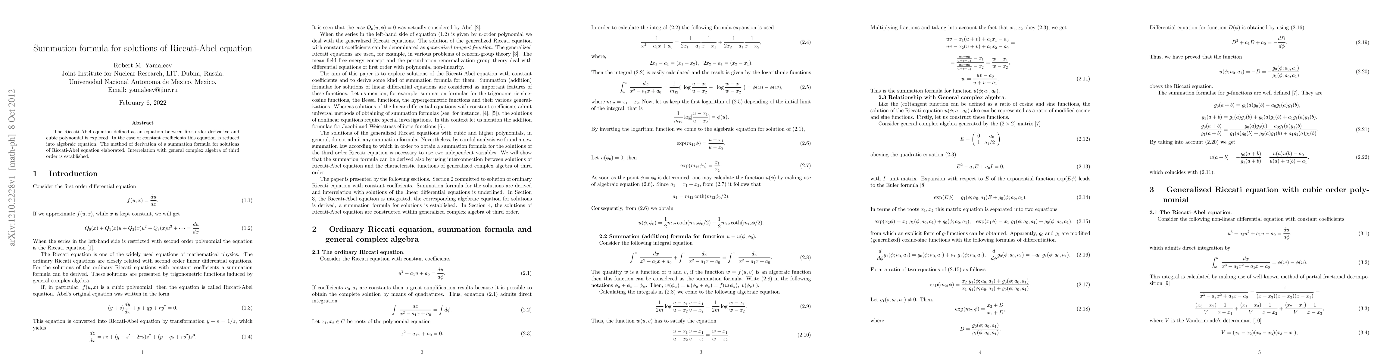 The generalized Riccati equation defined as an equation between first order derivative and the cubic polynomial is named Riccati-Abel equation. Unlike solutions of ordinary Riccati equation, the solutions of Riccati-Abel equation do not admit an addition formula. In the present paper we explain a nature of this fault and elaborate a method of solution of this problem. We show that the addition formula for Riccati-Abel equation can be established only for pair of solutions. Furthermore, it is shown that analogously with ordinary Riccati equation, the relationships with linear differential equations and the general complex algebra of third order can be established only for the pair of solutions of Riccati-Abel equation.