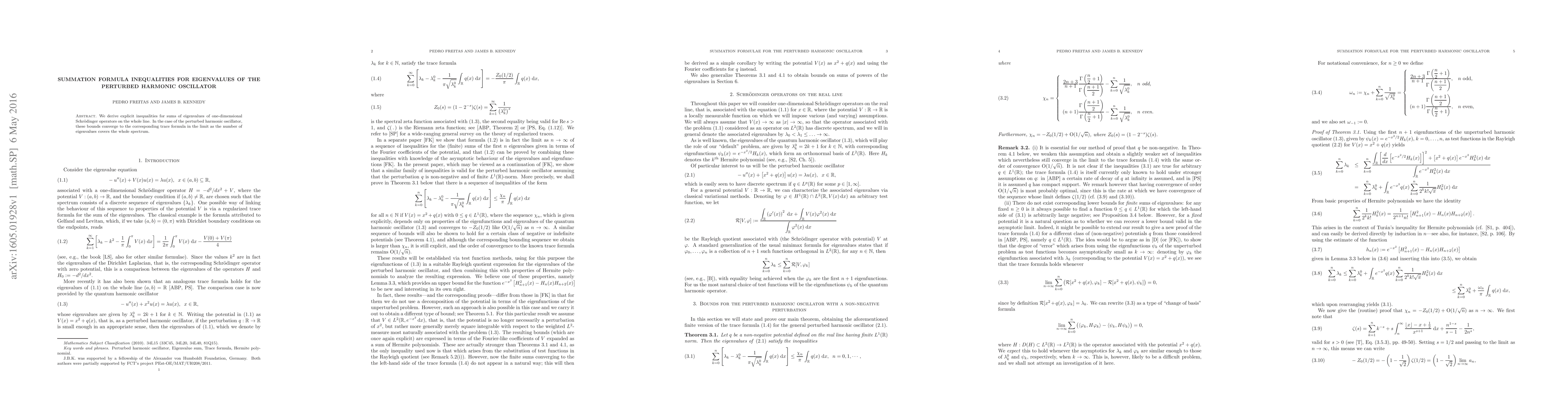 This paper derives explicit inequalities for sums of eigenvalues of one-dimensional Schrödinger operators, specifically focusing on the perturbed harmonic oscillator, where these bounds converge to the trace formula as the number of eigenvalues spans the entire spectrum.