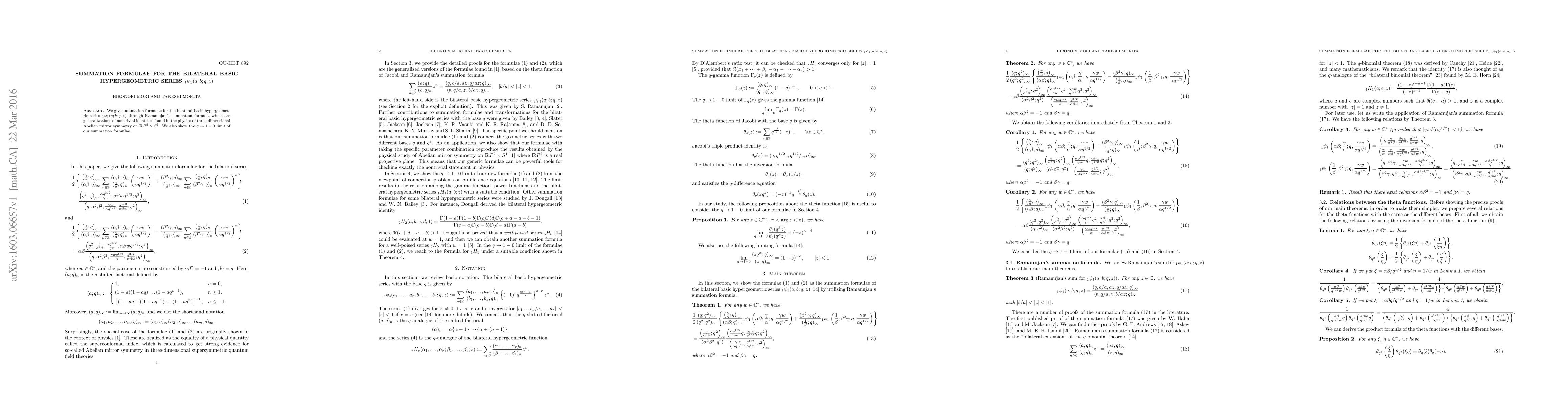 This paper presents summation formulae for the bilateral basic hypergeometric series ${}_1\psi_1( a; b; q, z )$ derived using Ramanujan's summation formula, extending identities relevant to three-dimensional Abelian mirror symmetry. The study also examines the limit as $q$ approaches $1$.