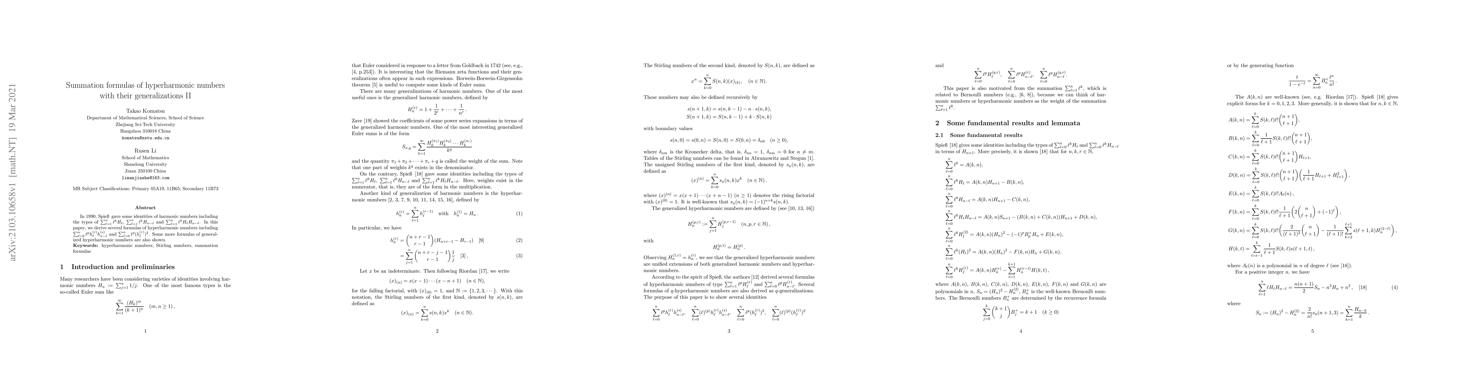 In 1990, Spie\ss \, gave some identities of harmonic numbers including the types of $\sum_{\ell=1}^n\ell^k H_\ell$, $\sum_{\ell=1}^n\ell^k H_{n-\ell}$ and $\sum_{\ell=1}^n\ell^k H_\ell H_{n-\ell}$. In this paper, we derive several formulas of hyperharmonic numbers including $\sum_{\ell=0}^{n} {\ell}^{p} h_{\ell}^{(r)} h_{n-\ell}^{(s)}$ and $\sum_{\ell=0}^n \ell^{p}(h_{\ell}^{(r)})^{2}$. Some more formulas of generalized hyperharmonic numbers are also shown.