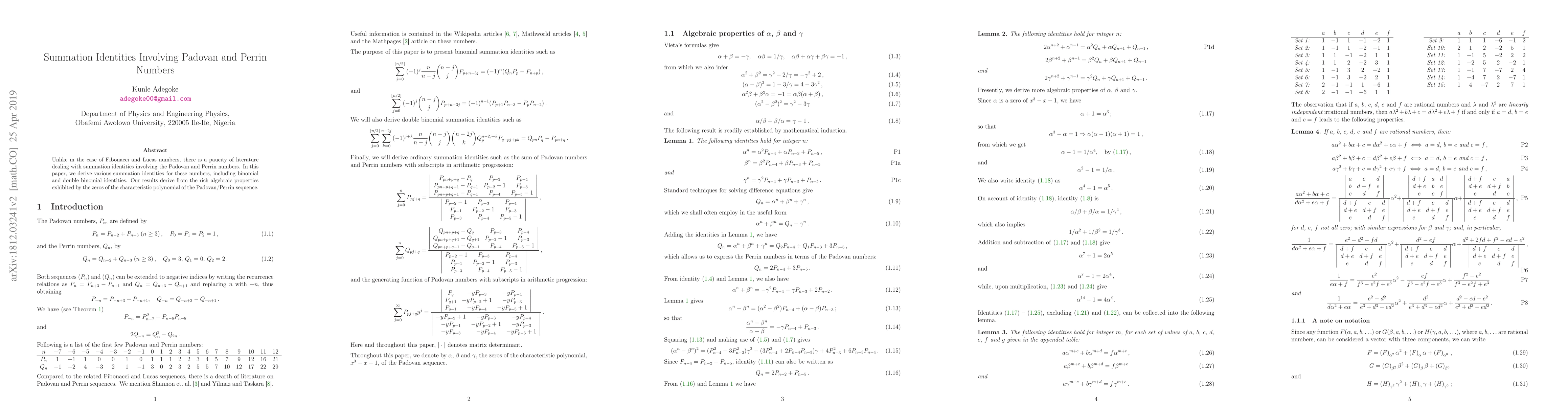 The paper derives various summation identities for Padovan and Perrin numbers by exploiting the algebraic properties of the characteristic polynomial zeros.