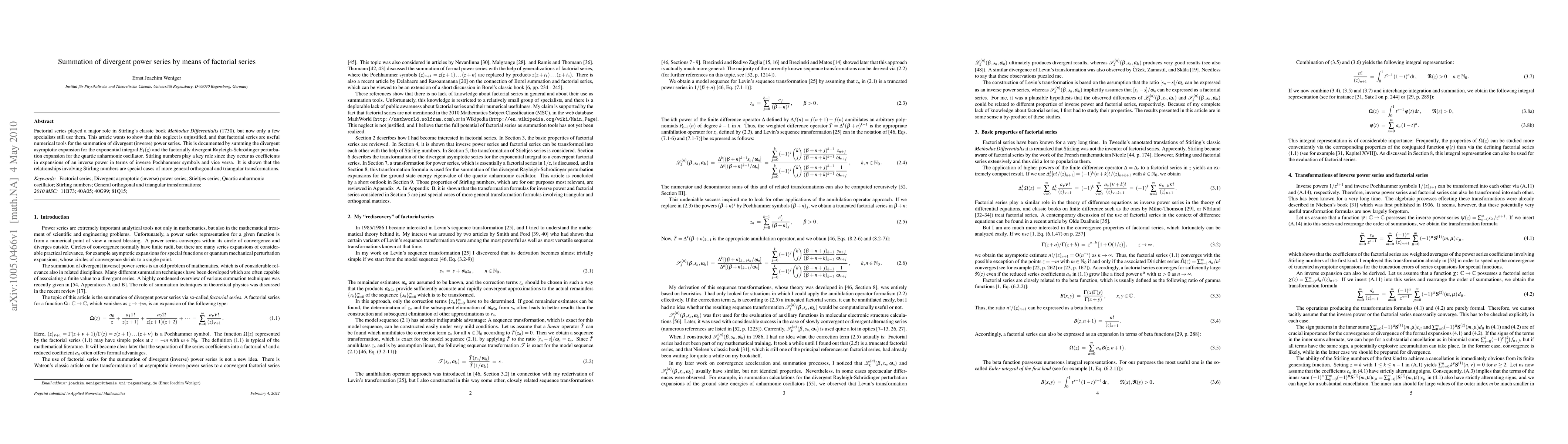 Factorial series played a major role in Stirling's classic book "Methodus Differentialis" (1730), but now only a few specialists still use them. This article wants to show that this neglect is unjustified, and that factorial series are useful numerical tools for the summation of divergent (inverse) power series. This is documented by summing the divergent asymptotic expansion for the exponential integral $E_{1} (z)$ and the factorially divergent Rayleigh-Schr\"{o}dinger perturbation expansion for the quartic anharmonic oscillator. Stirling numbers play a key role since they occur as coefficients in expansions of an inverse power in terms of inverse Pochhammer symbols and vice versa. It is shown that the relationships involving Stirling numbers are special cases of more general orthogonal and triangular transformations.