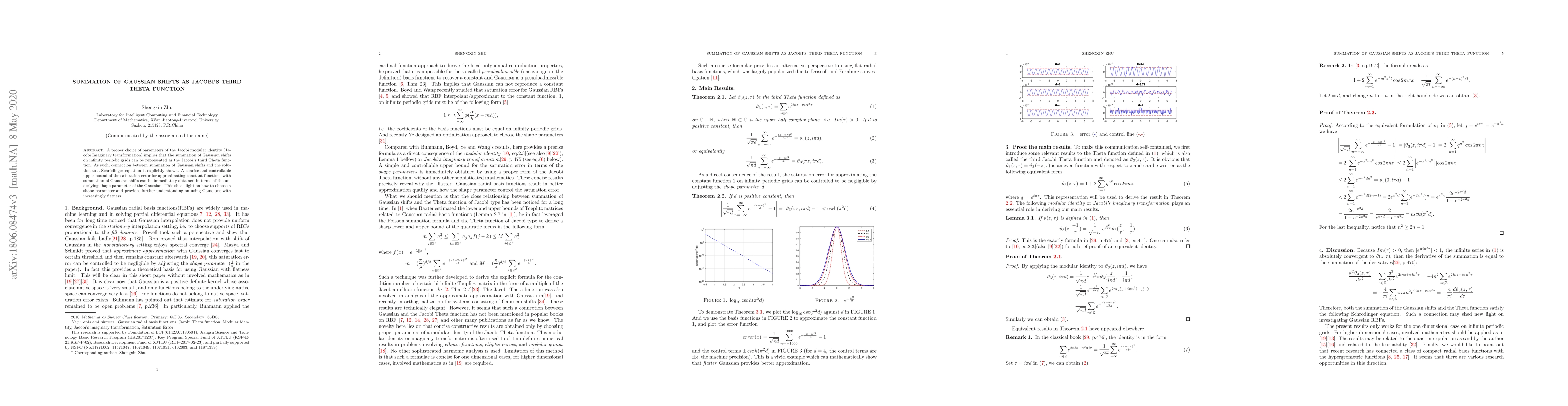 A proper choice of parameters of the Jacobi modular identity (Jacobi Imaginary transformation) implies that the summation of Gaussian shifts on infinity periodic grids can be represented as the Jacobi's third Theta function. As such, connection between summation of Gaussian shifts and the solution to a Schr\"{o}dinger equation is explicitly shown. A concise and controllable upper bound of the saturation error for approximating constant functions with summation of Gaussian shifts can be immediately obtained in terms of the underlying shape parameter of the Gaussian. This shed light on how to choose a shape parameter and provides further understanding on using Gaussians with increasingly flatness.