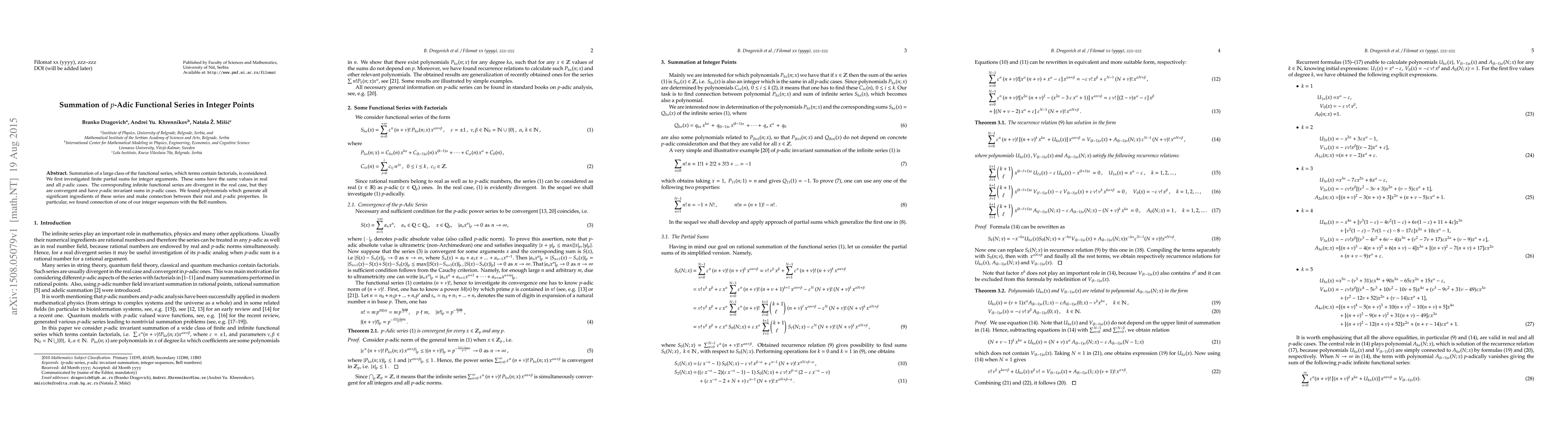 This paper explores the summation of functional series with factorial terms, showing that finite partial sums for integer arguments yield identical results in both real and p-adic number systems. It reveals that while the series diverge in the real case, they converge in p-adic contexts, with invariant sums, and identifies polynomials that bridge the real and p-adic properties, linking one sequence to Bell numbers.
