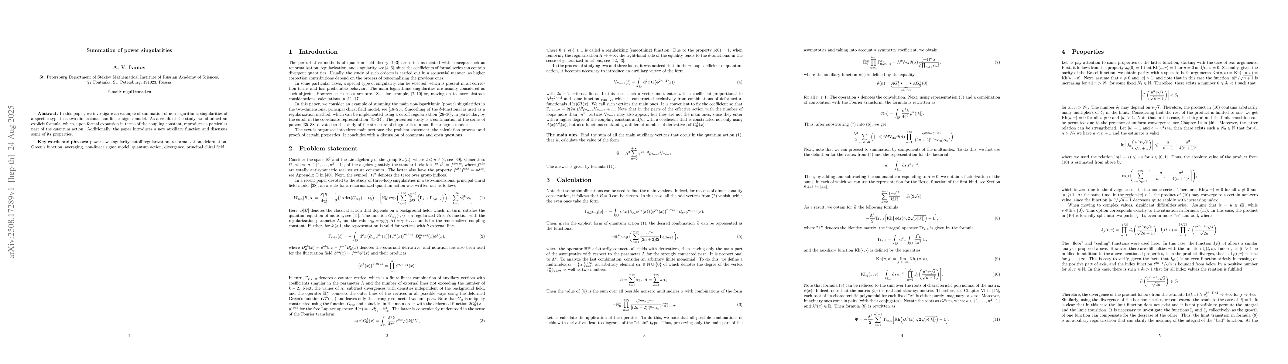 In this paper, we investigate an example of summation of non-logarithmic singularities of a specific type in a two-dimensional non-linear sigma model. As a result of the study, we obtained an explicit formula, which, upon formal expansion in terms of the coupling constant, reproduces a particular part of the quantum action. Additionally, the paper introduces a new auxiliary function and discusses some of its properties.