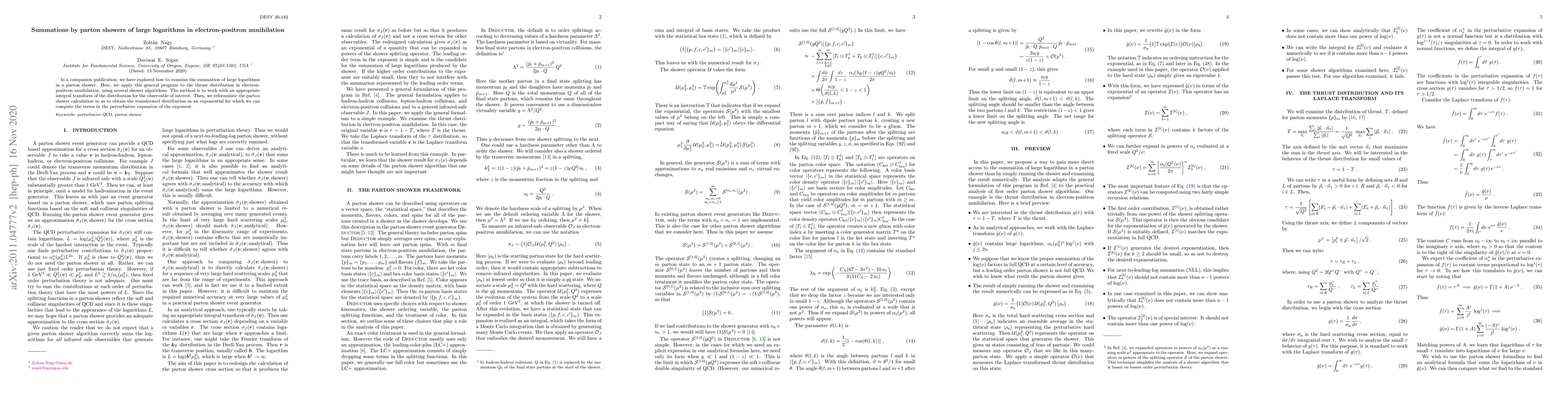 This paper investigates the summation of large logarithms in parton showers, specifically applying the method to the thrust distribution in electron-positron annihilation. The authors reformulate the shower calculation to compute the transformed distribution as an exponential, facilitating the perturbative expansion of the exponent.
