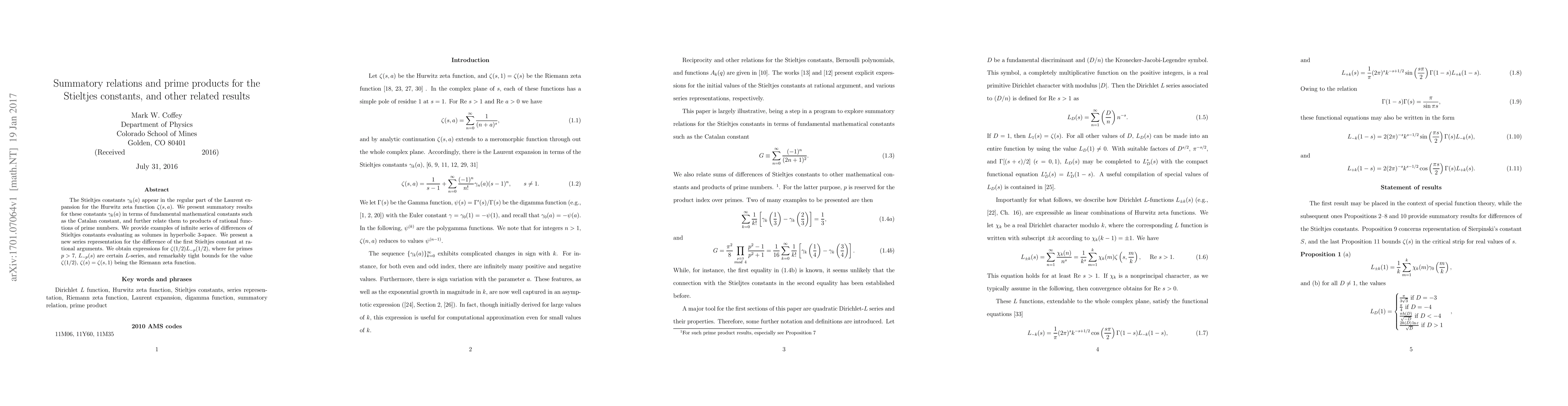 This paper explores summatory relations and prime products associated with the Stieltjes constants, revealing connections to fundamental constants and hyperbolic geometry. It introduces new series representations and tight bounds for the Riemann zeta function at critical points.