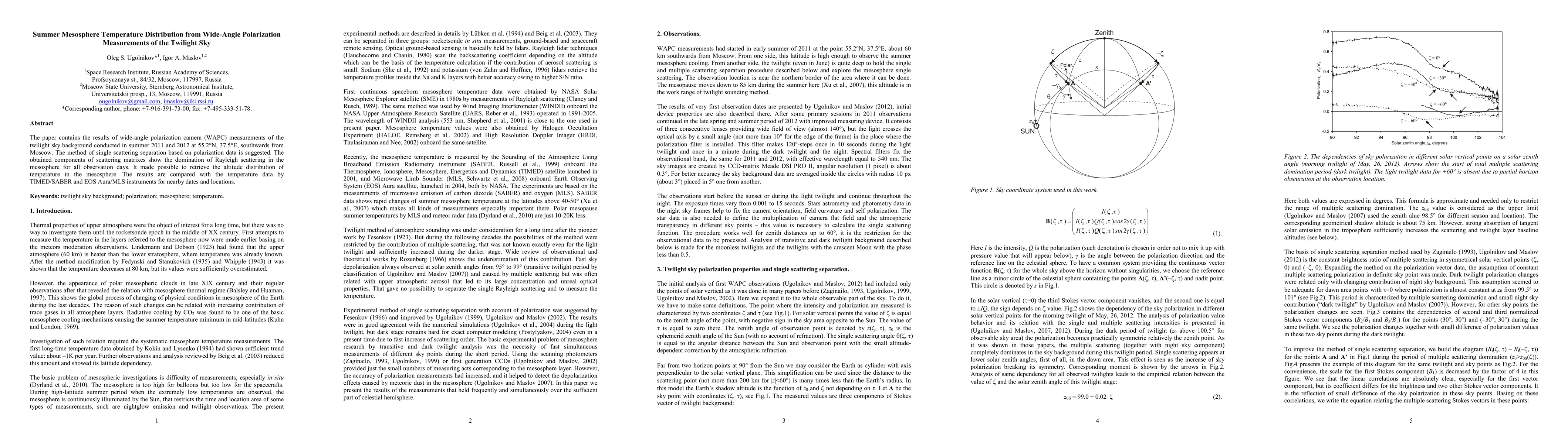 This paper reports on the summer mesosphere temperature distribution derived from wide-angle polarization camera measurements of the twilight sky, revealing the dominance of Rayleigh scattering. The results are compared with satellite data from TIMED/SABER and EOS Aura/MLS for validation.