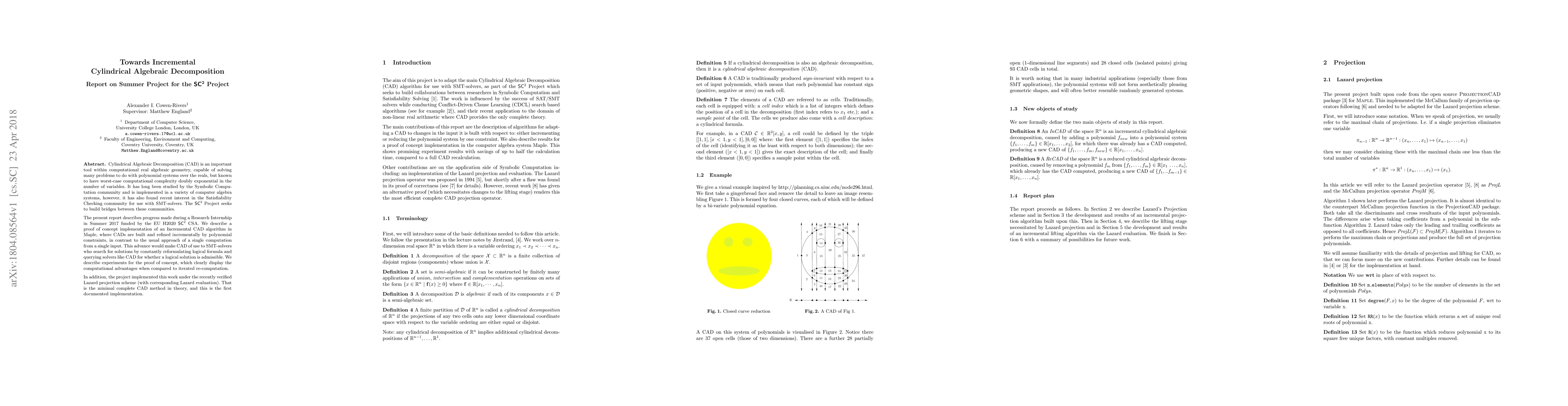 Cylindrical Algebraic Decomposition (CAD) is an important tool within computational real algebraic geometry, capable of solving many problems to do with polynomial systems over the reals, but known to have worst-case computational complexity doubly exponential in the number of variables. It has long been studied by the Symbolic Computation community and is implemented in a variety of computer algebra systems, however, it has also found recent interest in the Satisfiability Checking community for use with SMT-solvers. The SCSC Project seeks to build bridges between these communities. The present report describes progress made during a Research Internship in Summer 2017 funded by the EU H2020 SCSC CSA. We describe a proof of concept implementation of an Incremental CAD algorithm in Maple, where CADs are built and refined incrementally by polynomial constraint, in contrast to the usual approach of a single computation from a single input. This advance would make CAD of use to SMT-solvers who search for solutions by constantly reformulating logical formula and querying solvers like CAD for whether a logical solution is admissible. We describe experiments for the proof of concept, which clearly display the computational advantages when compared to iterated re-computation. In addition, the project implemented this work under the recently verified Lazard projection scheme (with corresponding Lazard evaluation). That is the minimal complete CAD method in theory, and this is the first documented implementation.