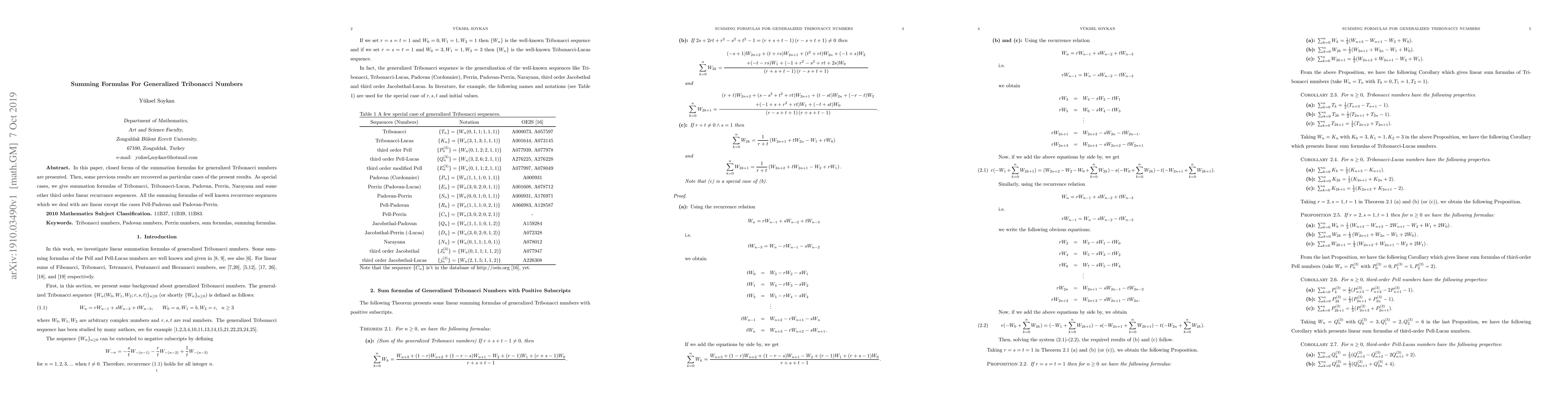 In this paper, closed forms of the summation formulas for generalized Tribonacci numbers are presented. Then, some previous results are recovered as particular cases of the present results. As special cases, we give summation formulas of Tribonacci, Tribonacci-Lucas, Padovan, Perrin, Narayana and some other third order linear recurrance sequences. All the summing formulas of well known recurrence sequences which we deal with are linear except the cases Pell-Padovan and Padovan-Perrin.